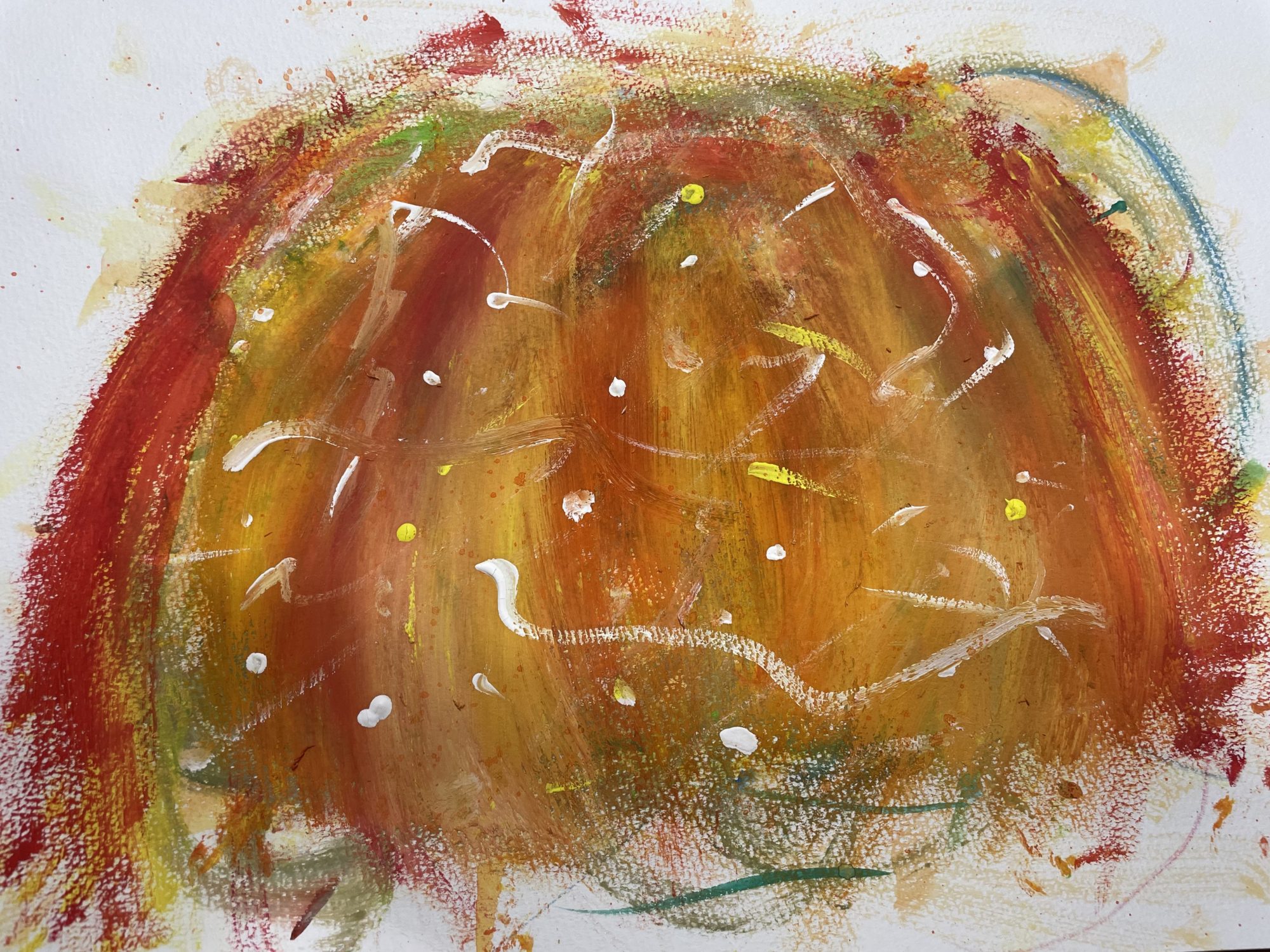 赤やオレンジ、黄色が重なりあって、まるで熱や光が噴き上がるよう。タイトルの「赤い噴水」がぴったりです。ティッシュで絵の具をこすったことで、偶然できた色の混ざりや跡が作品に生命感を与えていますね。筆では出せない“にじみとざらつき”が、炎や土のような質感を生んでいます。