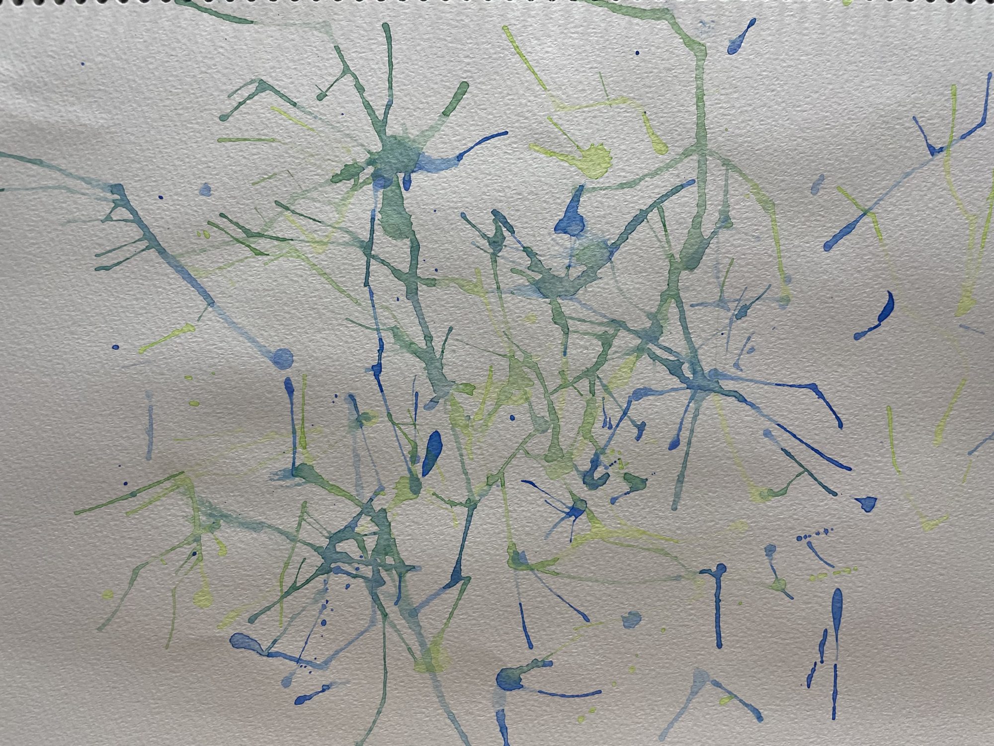 青と黄緑のインクが枝のように広がっていて、風にゆれる木々や花火の光の残像を思わせます。偶然できるにじみや線が“生きものの動き”のようで、夏の生命感を感じます。