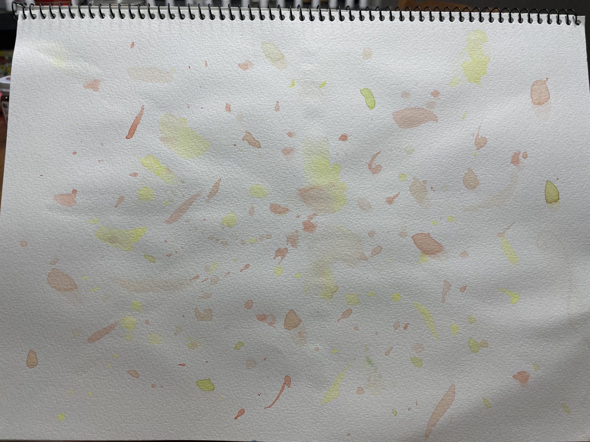 やわらかなオレンジや黄色のしみが、落ち葉がふんわり舞い降りる瞬間のよう。余白の多さが空気を感じさせ、しずかに季節が移り変わる情景を上手に表していますね。