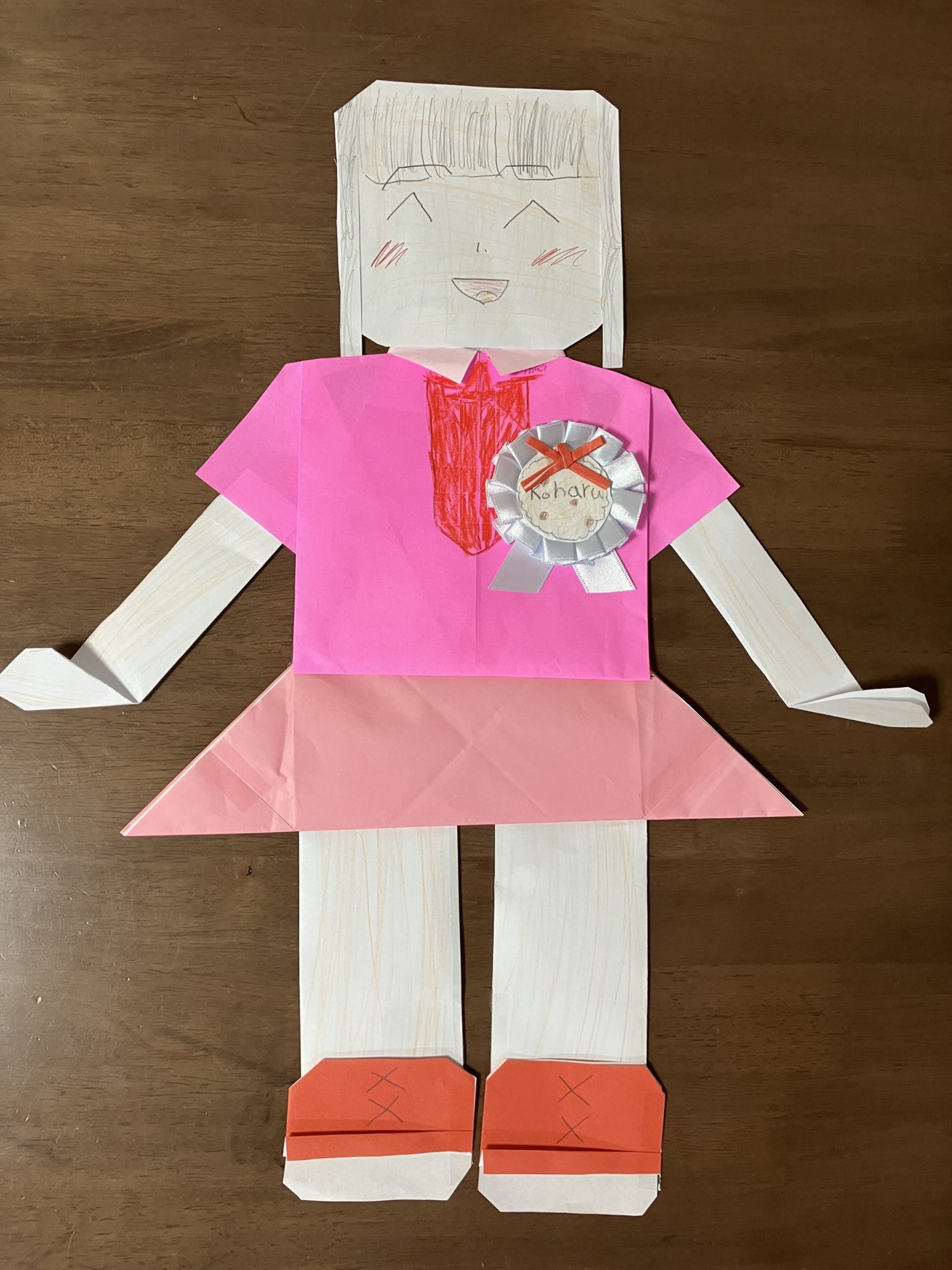 ピンクのTシャツやスカート、オレンジのくつなど、色の組み合わせがやさしくて、見ているこちらまで笑顔になります。リボンのバッジには「Koharu」の名前が書かれていて、自分らしさがしっかり表れていますね。