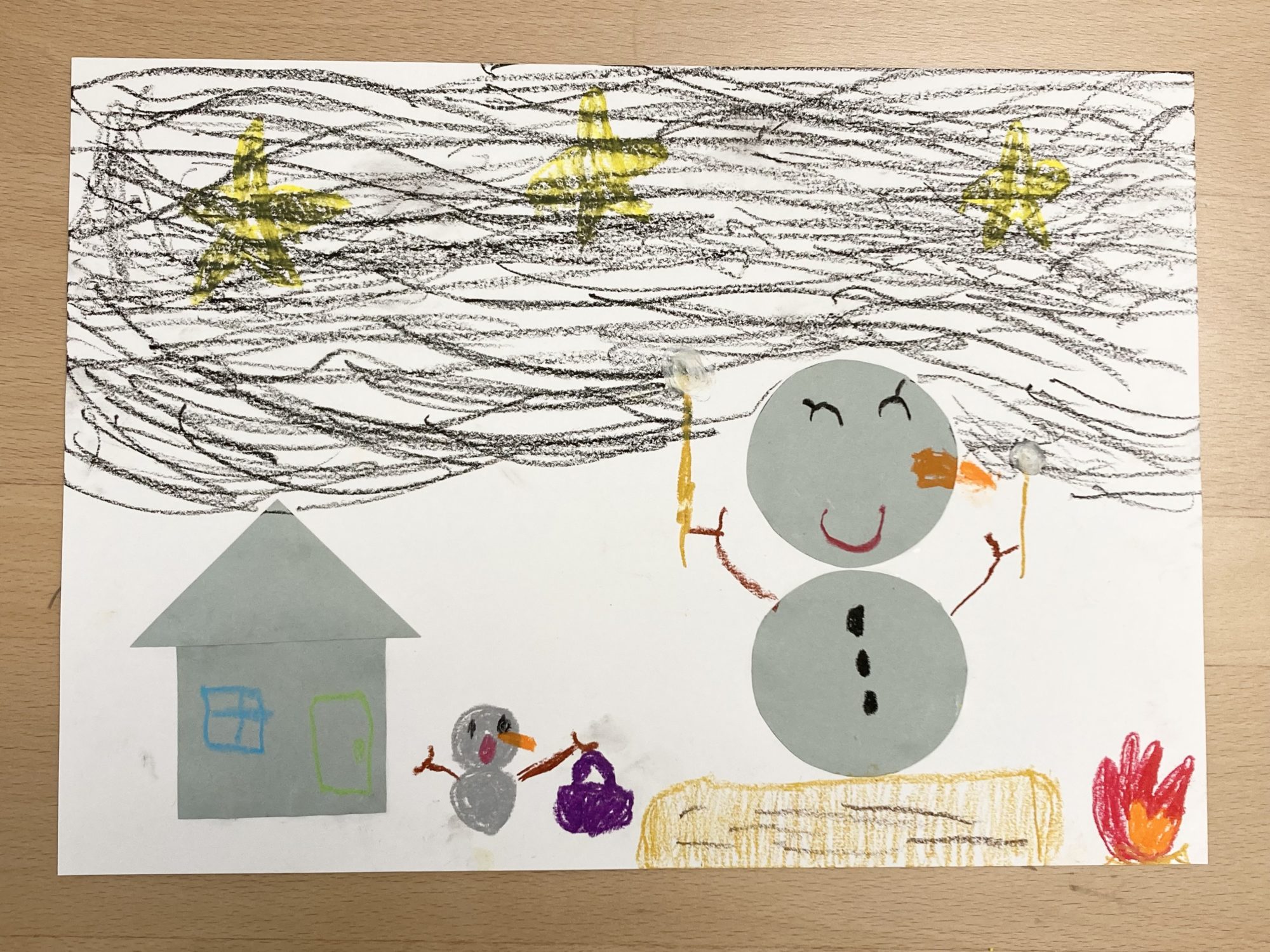 丸・三角・四角を上手に使って、形から物語を生み出したところがとてもステキです。お母さん雪だるまが忘れ物を届ける場面には、家族の思いやりが感じられますね。