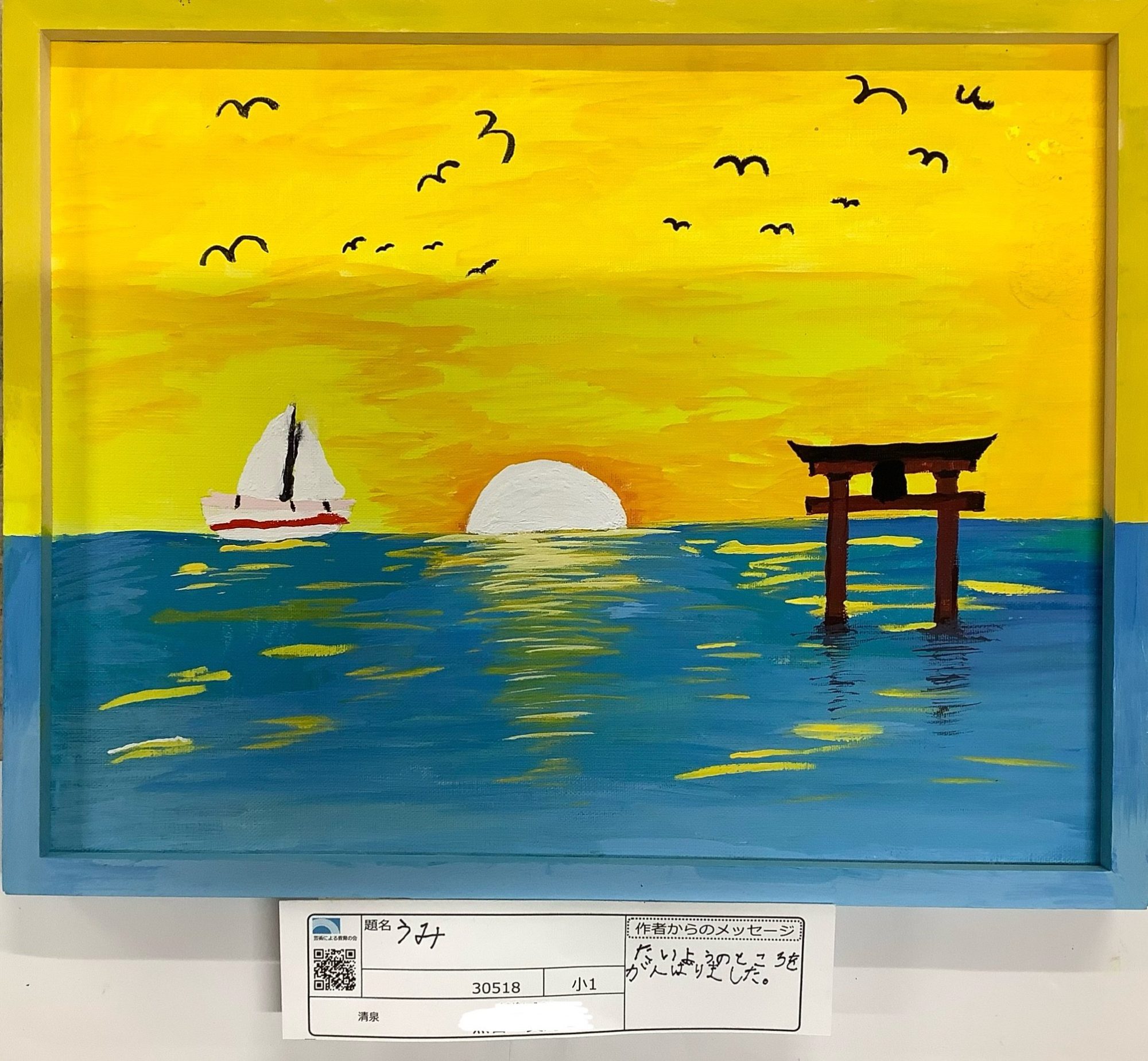 わかめせんせい 先生2025年12月27日 8:21 AM kumagaiminoriさん、 画面いっぱいに広がる、 まぶしい夕方の海がとても印象的です🌅 空の黄色と、 海の青の分かれ方がはっきりしていて、 時間帯や空気の感じが すっと伝わってきます。 太陽が半分だけ見えているところも、 「今この瞬間」を切り取ったようで、 とてもきれいですね。 海の中に入った光の線が、 リズムよく並んでいて、 水面がゆらゆら動いている感じが 上手に表れています。 船や鳥居、鳥の形も、 少ない形なのに、 それぞれの場所や役割が しっかりわかります。 この海は、 しずかな時間でしょうか。 それとも、 これからなにかが始まりそうな時間でしょうか? ログインして返信する ↓
