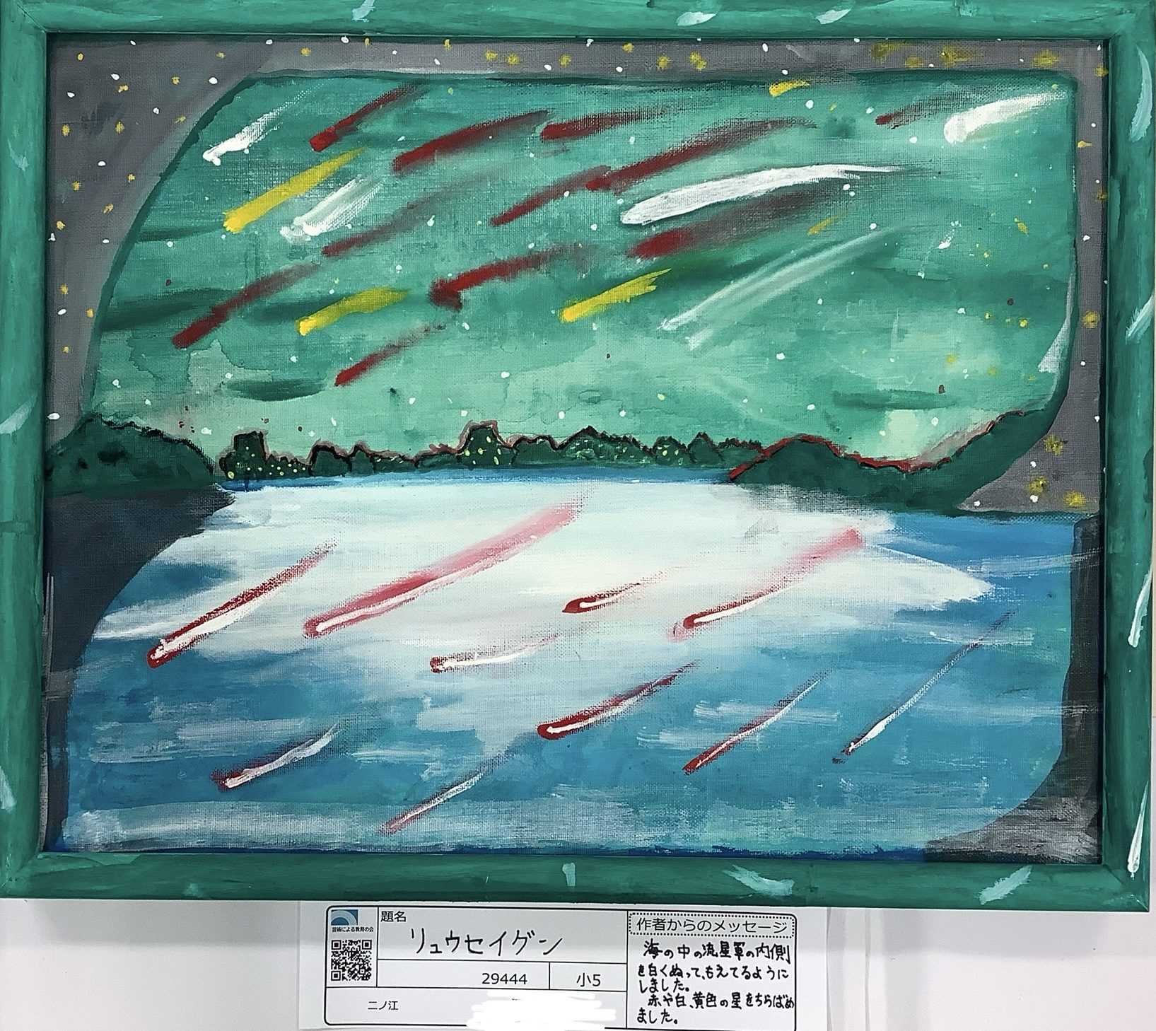 わかめせんせい 先生2025年12月27日 8:49 AM saki さんへ 空いっぱいに流れていく線の勢いが、とても気持ちいい作品です。 上の空と、下の水のような広がりがはっきり分かれていて、 「見上げている場所」と「見下ろしている場所」が、 一枚の中で同時に感じられます。 赤や黄色、白の流れ星が、 同じ方向に、でも少しずつ速さを変えて走っていて、 一瞬で消えてしまうはずの光が、 この絵の中では時間をのばして見せてくれているようです。 遠くの山のシルエットや、 暗い縁取りがあることで、 夜の静けさと、空の大きさがより強く伝わってきます。 大胆に描いたところと、 ていねいに重ねたところの両方があって、 空を想像しながら何度も手を動かした様子が感じられます。 saki さんは、 この流れ星を、 どこから、どんな気持ちで眺めているつもりだったのでしょうか? ログインして返信する ↓
