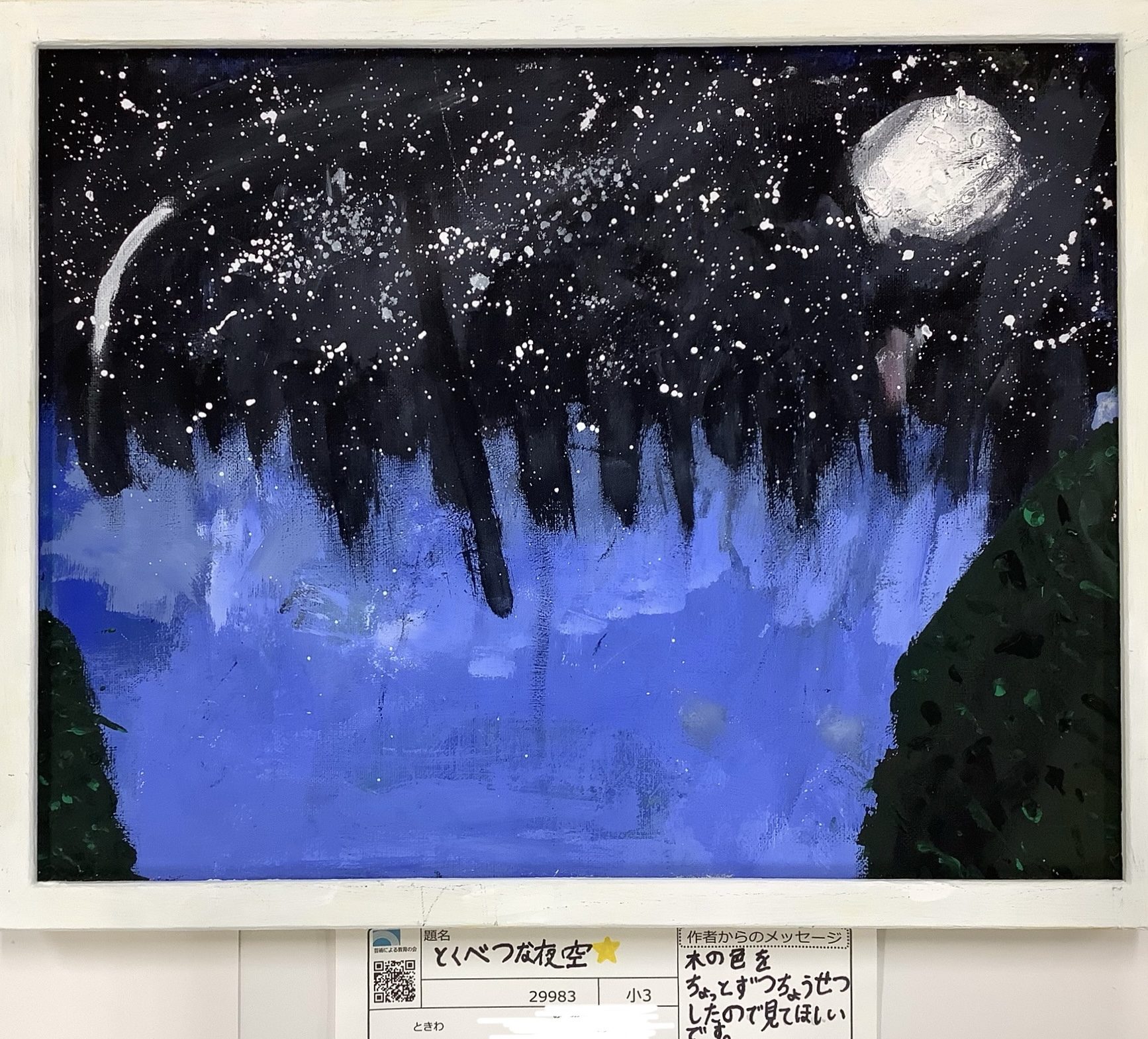 わかめせんせい 先生2025年12月27日 8:58 AM iroha さんへ この絵は、 「夜空」を描いているのに、 空だけを見せていないところが とてもいいと思いました。 上の黒は、 ただ暗い黒ではなくて、 ところどころに にじみや重なりがあって、 夜が生きている感じがします。 白い星も、 点々と同じように置いたのではなく、 密なところと、 少し静かなところがあって、 見る目が自然に動きます。 月も、 まん丸で目立つけれど、 光りすぎていなくて、 「静かな月」ですね。 夜空の中で ちゃんと呼吸しているみたいです。 そして、 下の青と、左右の木。 ここがこの絵の 「とくべつ」なところだと思います。 夜空を 下から見上げている感じ、 森の中で ひとり空を見ている気配が 伝わってきます。 「木の色を ちょっとずつぬった」 という言葉どおり、 緑の中にも たくさんの色があって、 時間をかけて 見てほしい絵です。 iroha さんは、 この夜空を見ているのは だれだと思って描きましたか? それとも、 見る人が その場所に立つつもりだったのでしょうか。 ログインして返信する ↓