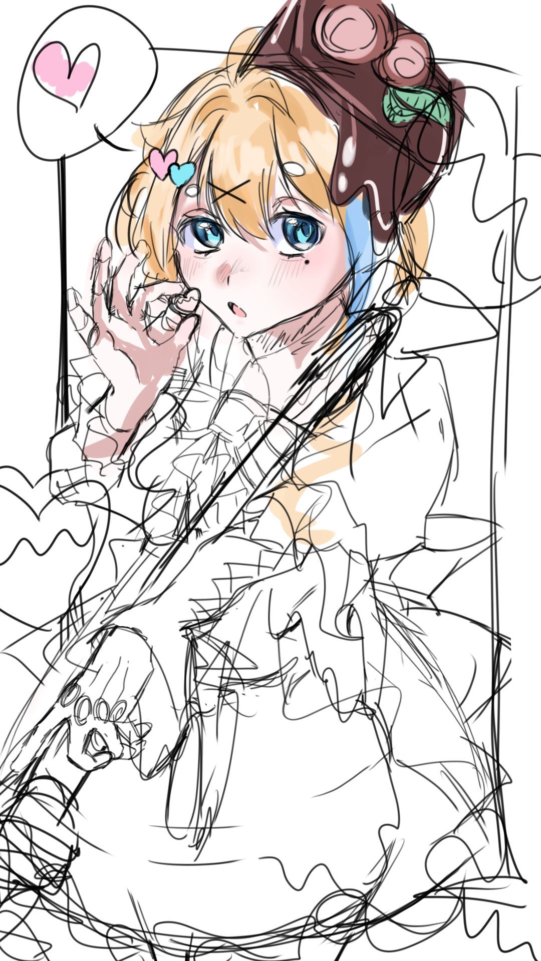 頭の上のチョコレートのようなモチーフは、質感がしっかり描き分けられていて、ツヤの乗せ方がとても上手です。液体が垂れているようなニュアンスが動きをつくり、全体の物語性を強めていますね。また、線の勢いも心地よく、ラフ特有の“描きながら考えているエネルギー”が画面いっぱいに広がっていて、見ていてワクワクします。