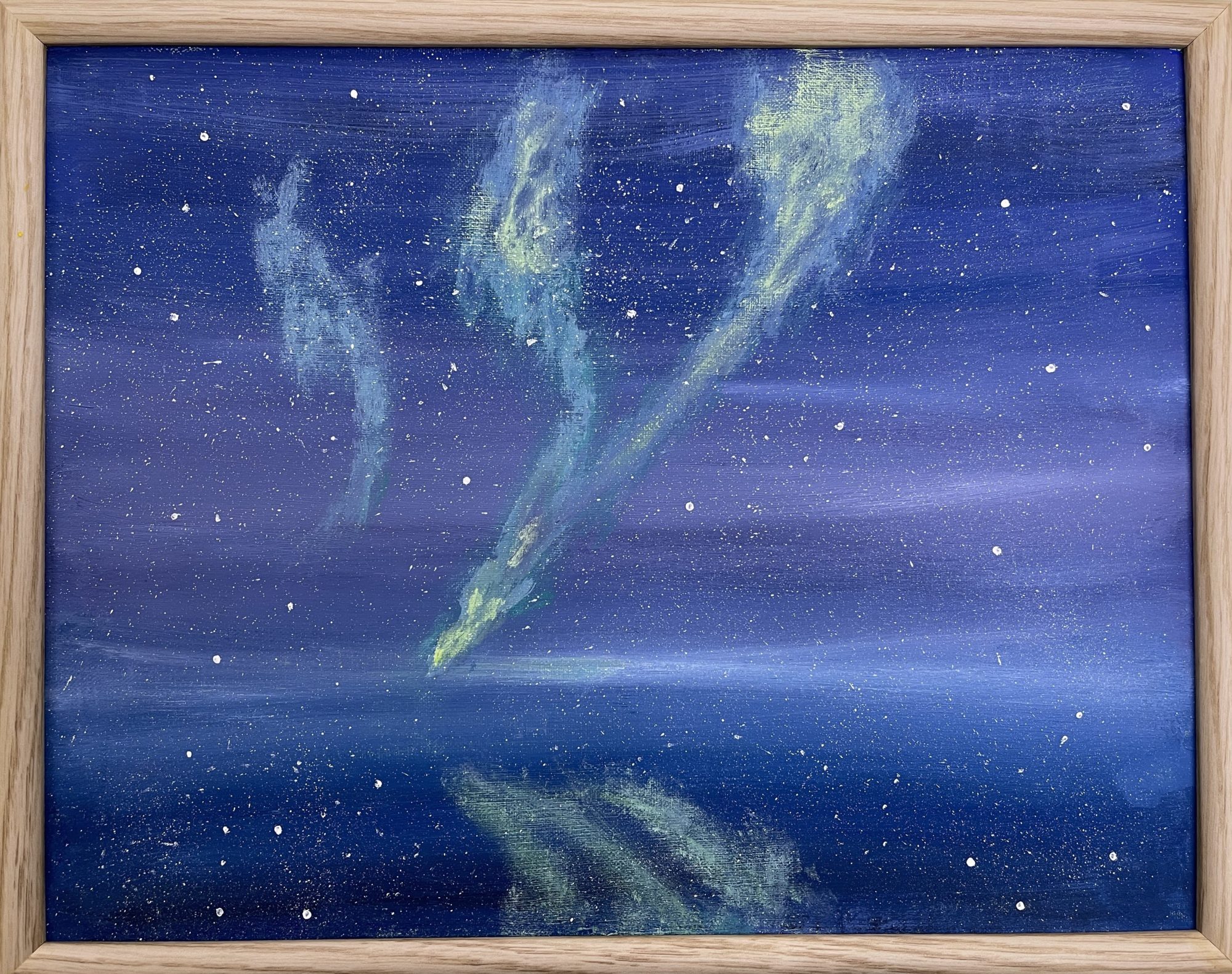 わかめせんせい 先生2025年12月27日 10:03 AM はるさん 夜の空が、 深い青でしずかに広がっています。 その中に、 ふわっと浮かびあがる光が、 とてもやさしく見えます。 オーロラの形が、 上から下へ、 ゆっくり流れていくようで、 時間まで描かれているようです。 光のところだけ、 少し黄緑が混ざっていて、 夜空との対比がとてもきれいです。 「メロンからできた」という発想も、 この作品をぐっと楽しくしています。 色を見ると、 たしかにメロンの中身みたいで、 思わずくすっとしました。 空の下にうつる、 うっすらとした光の映りこみも、 見逃せないところです。 このオーロラは、 どんな音を立てて、 空を流れていると思いますか。 ログインして返信する ↓