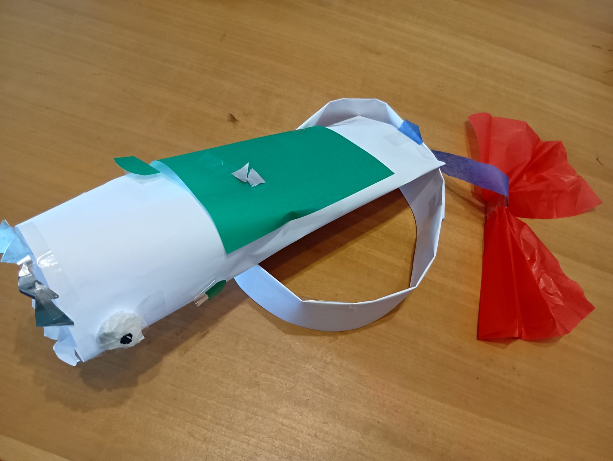 白・緑・赤・青・銀という色の組み合わせも印象的で、まるで古代の海の王者が現代に蘇ったような造形になっています。尾びれに使った赤いセロファンの軽やかさと、頭部の銀色の輝きとの対比がとても良いですね。紙という身近な素材でありながら、構造的にもしっかりしていて、形のバランス感覚も優れています。