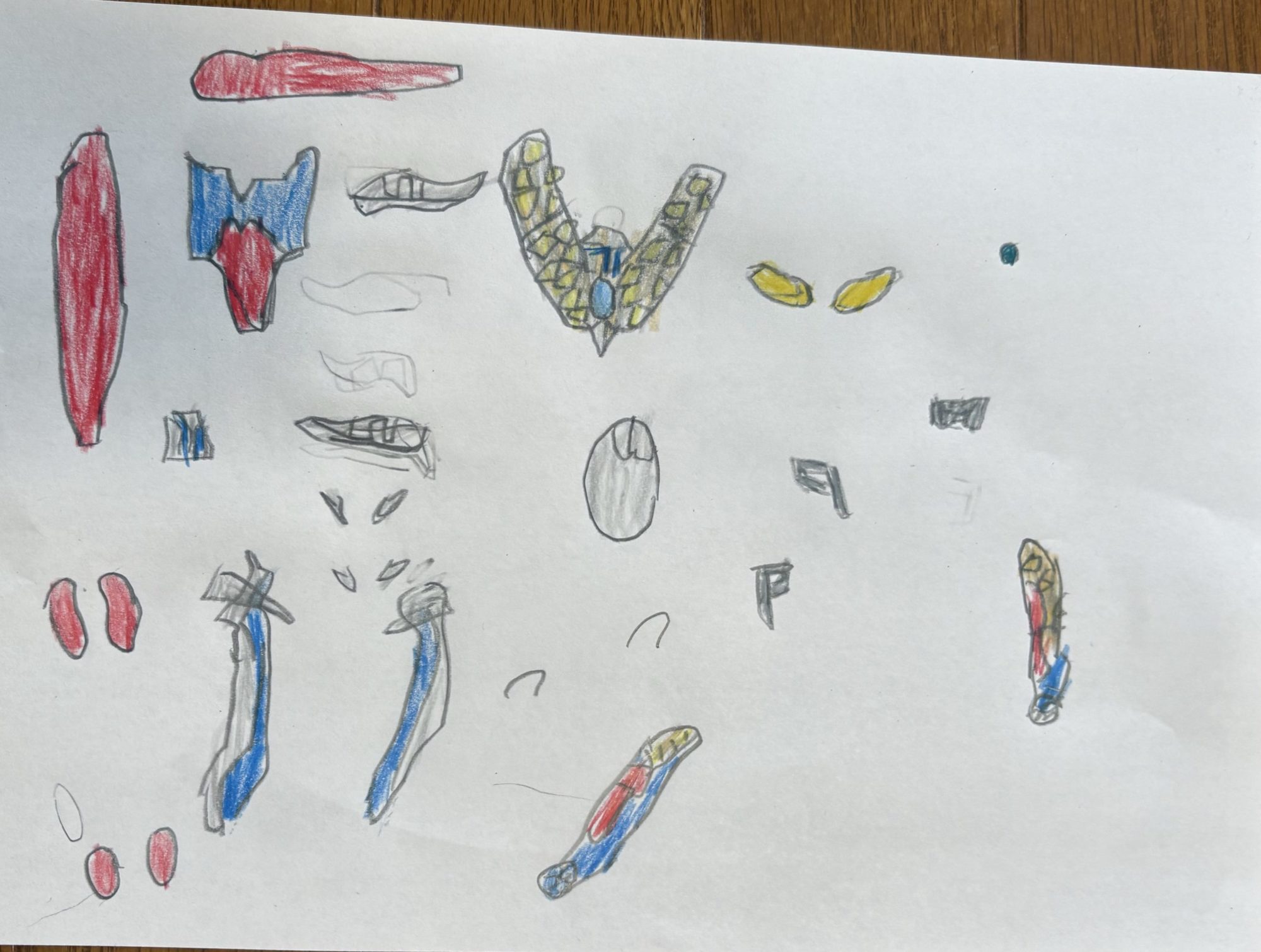 まずパーツをぜんぶ描いてから組み立てるという方法にびっくりしました。まるで本物の設計図みたいです。