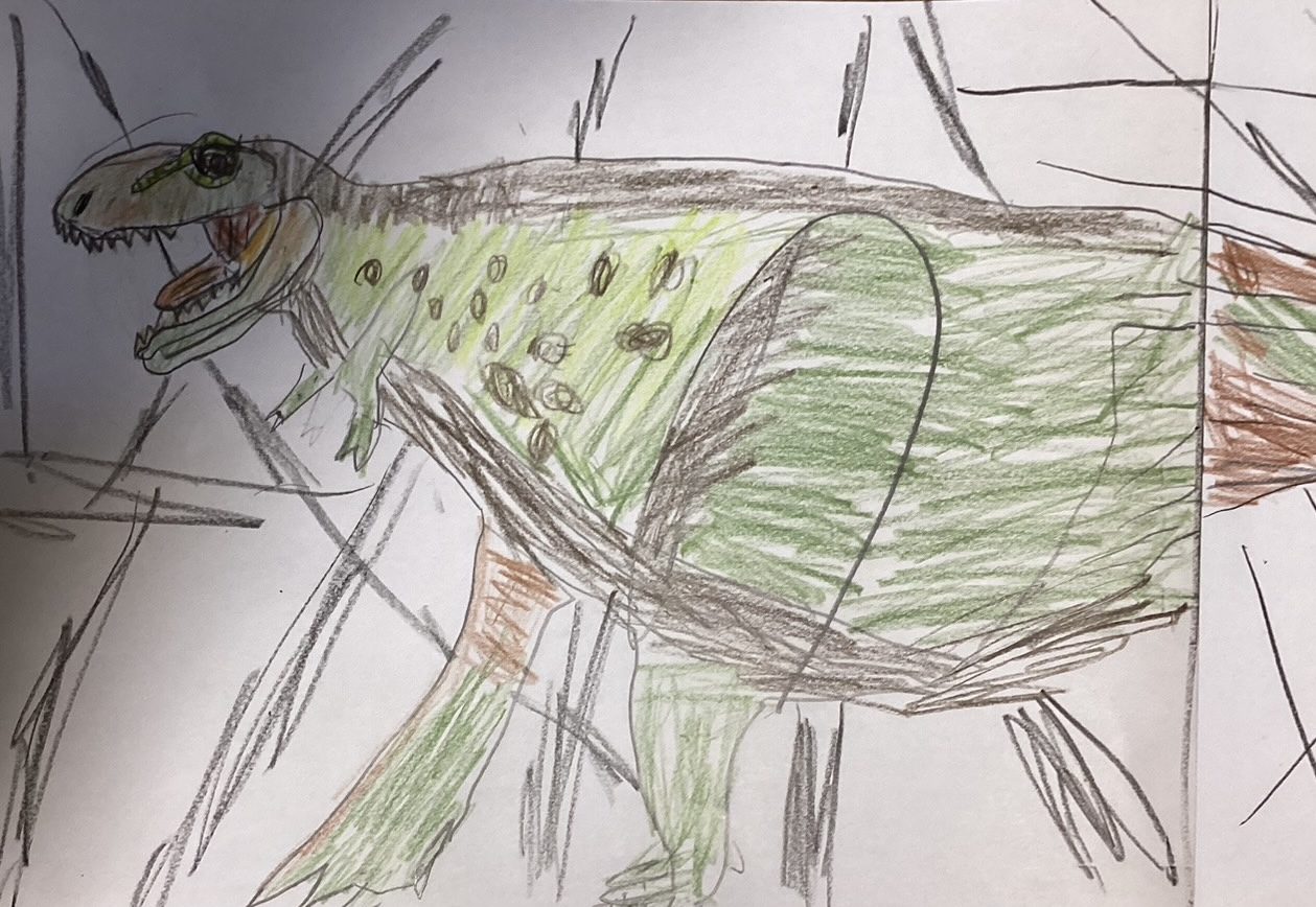 ティラノサウルスの、びみょうな色のちがいを、色えんぴつでみごとに表していますね✨
