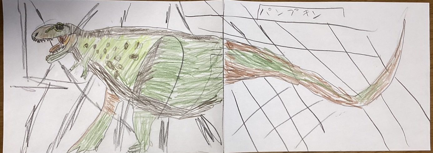 きくちわかこ 先生2025年11月20日 9:07 AM 画用紙をつなげると、大きくかけて、はくりょくまんてん!🦖 ティラノサウルスの、びみょうな色のちがいを、色えんぴつでみごとに表していますね✨ 左の方にかいてある、「パンプキン」が気になる…👀 かぼちゃのお店があるのかな⁉️ ログインして返信する ↓
