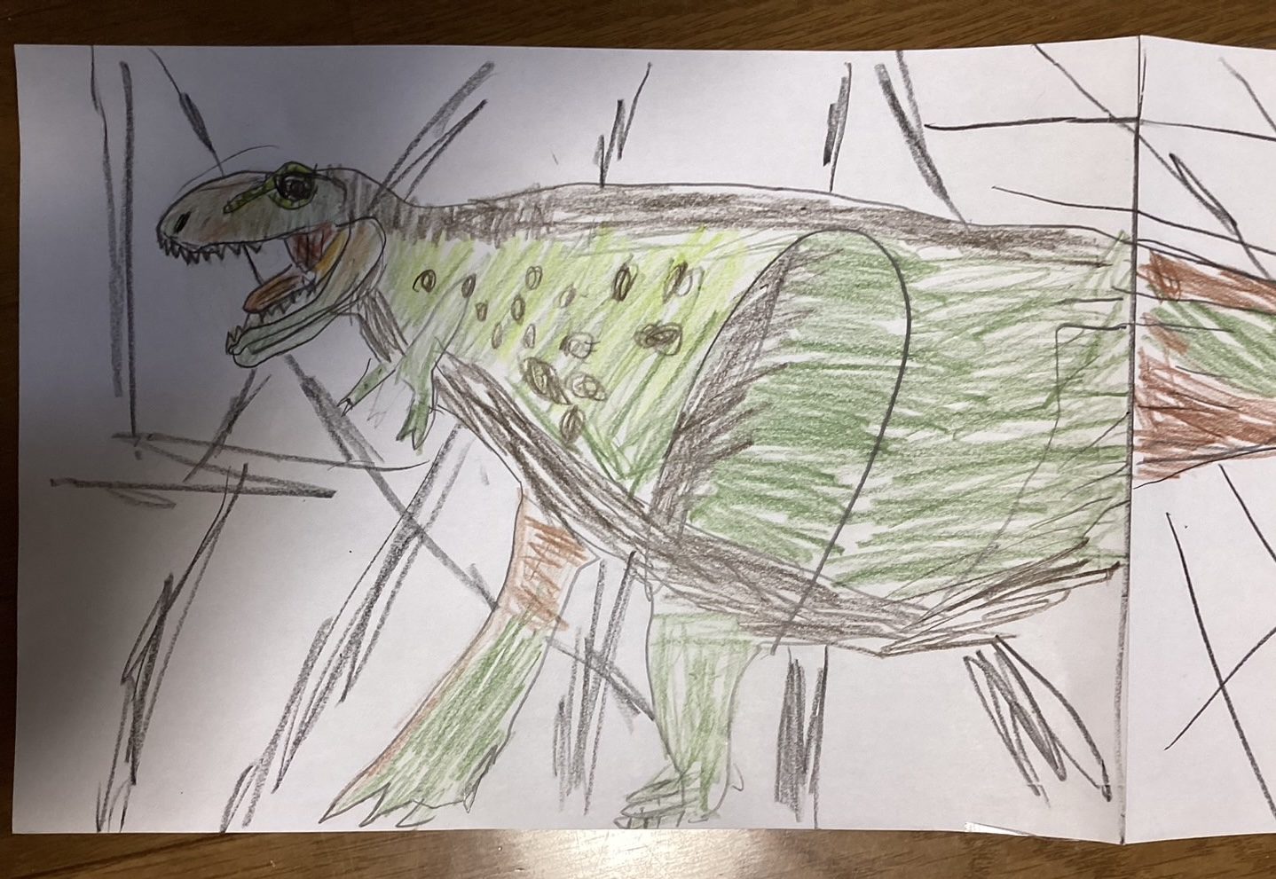 A4用紙を二枚つなげて、大きく全身を描いたスケールの大きさにまずびっくりしました。長いしっぽまでしっかり描かれていて、恐竜の力強さがよく伝わってきます。