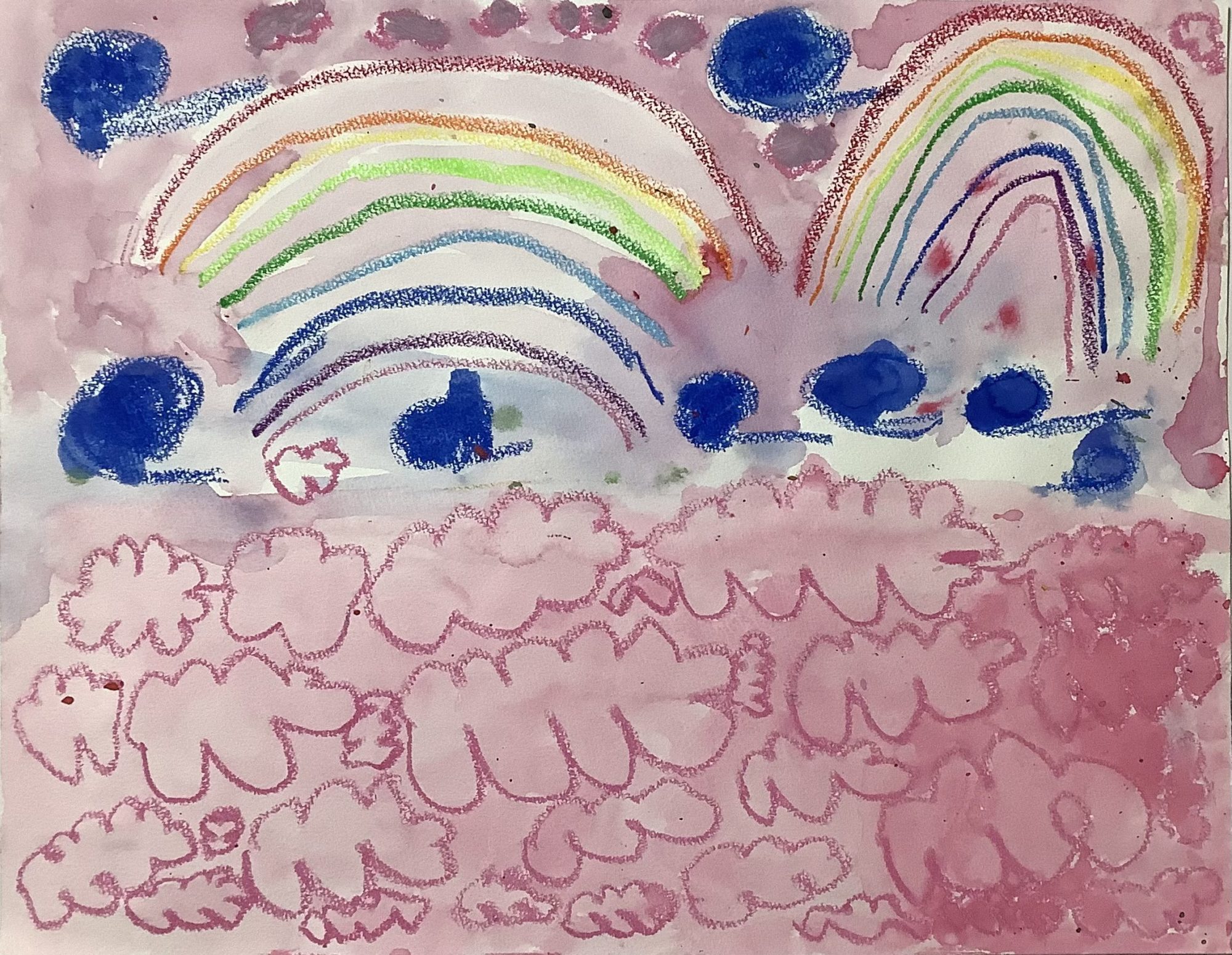 クレヨンの線でくもをくり返し描き、その上に色がにじんで重なっているところから、空がゆっくり動いているように感じました☁️🌈