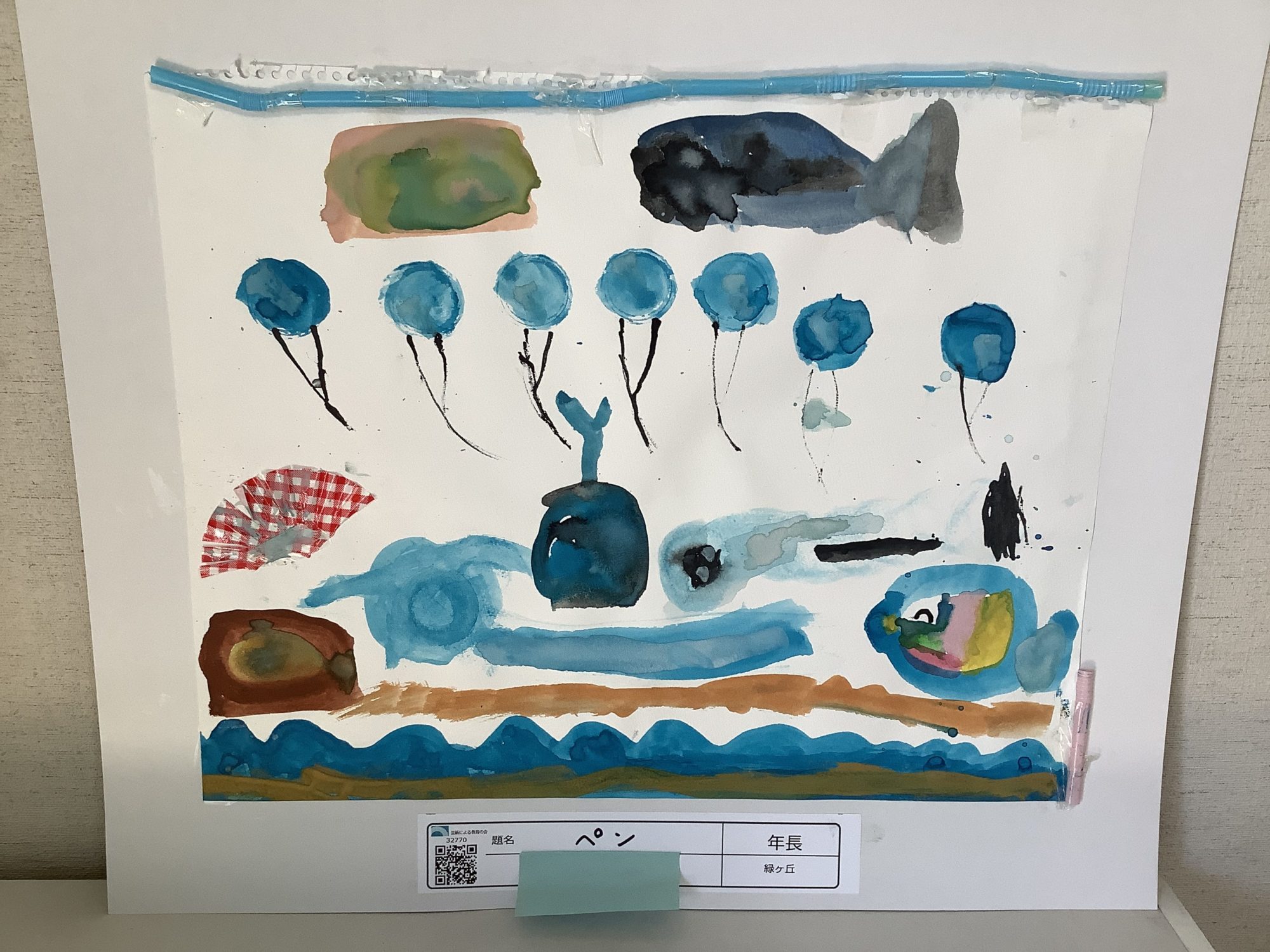 画面いっぱいに広がる青い色が、とても気持ちよく目に入ってきます。丸い形が並んでいたり、線が上下に流れていたりして、紙の上をペンや絵の具がたくさん動いたことが伝わってきました🎨