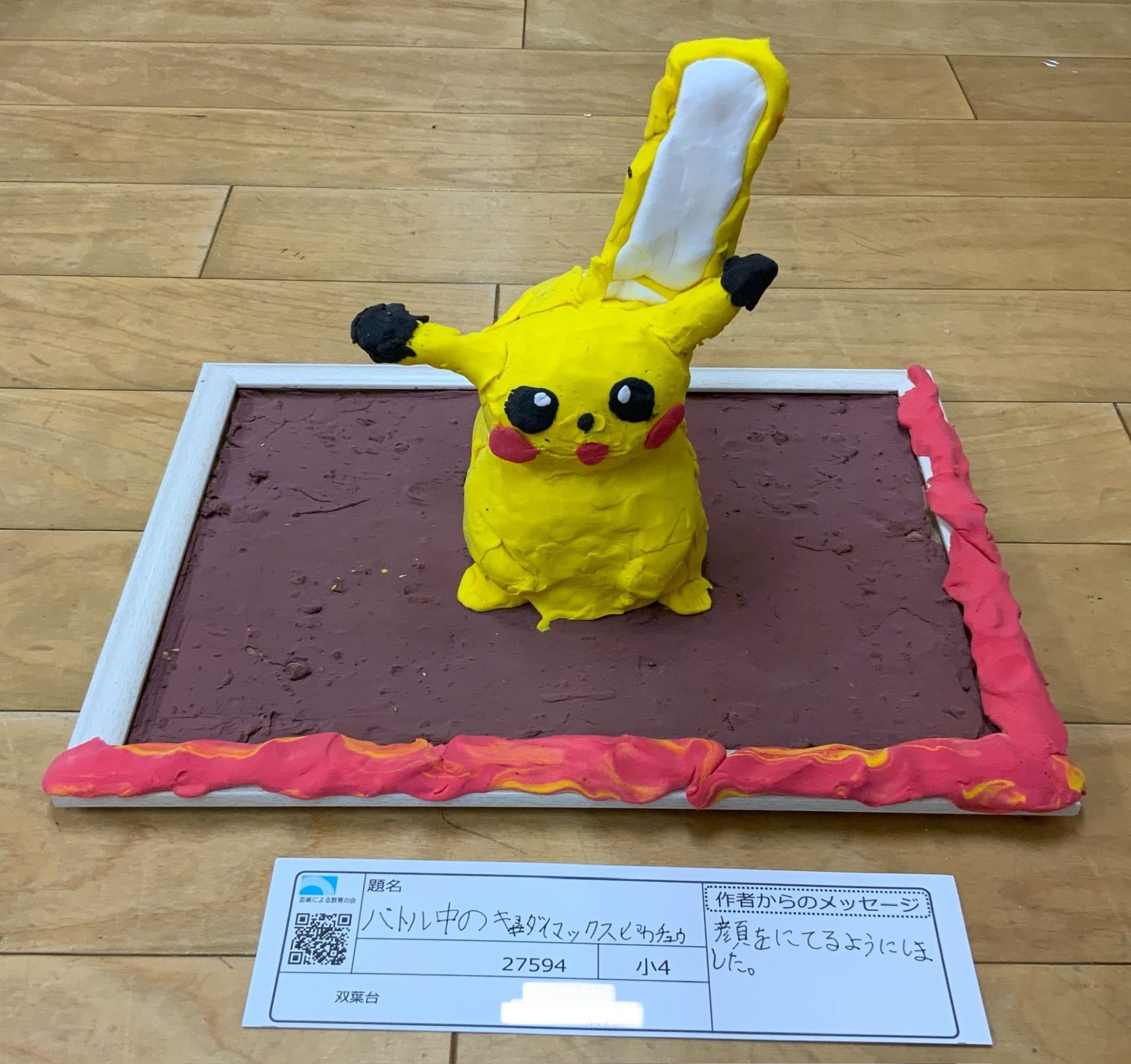 わかめせんせい 先生2025年12月27日 2:06 PM Souseiさん 真正面に立つピカチュウの存在感が、とても力強いですね⚡️ 大きく伸びた耳や、どっしりとした体つきから、「キョダイマックス」ならではの迫力がしっかり伝わってきます。 表情はかわいらしいのに、黒い手先や構えたポーズのおかげで、いままさにバトルの最中だと感じさせます🔥 足元のステージや、まわりを囲む赤いラインも、戦いの場を引き立てています。 粘土の厚みや指の跡が、そのままエネルギーになっているところも魅力です✨ Souseiさんは、ピカチュウのどんなところを一番強そうに見せたかったのかな? ログインして返信する ↓