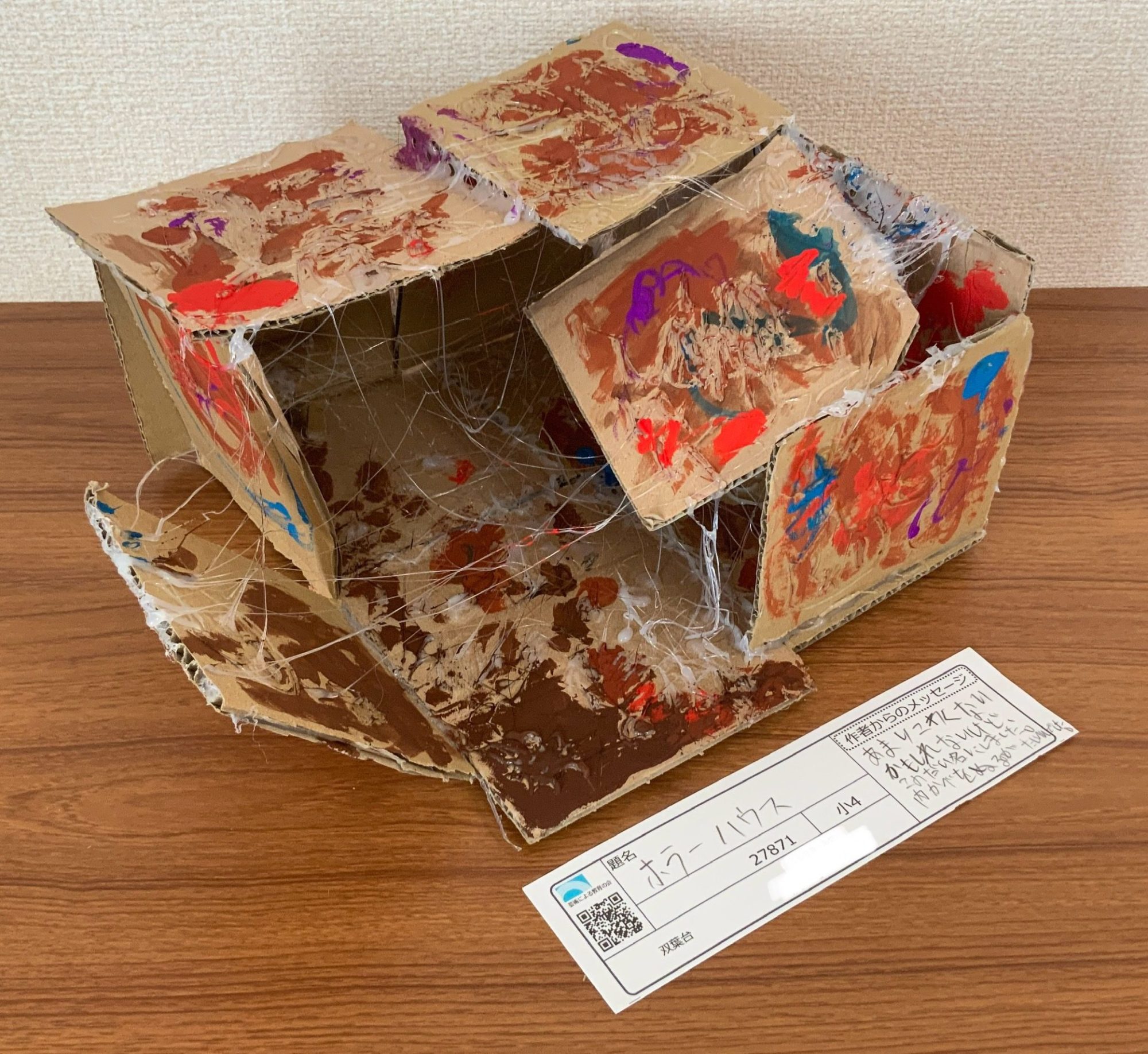わかめせんせい 先生2025年12月27日 3:10 PM あやさんへ。 この「ホラーハウス」、見た瞬間にドキッとしました…😳 ダンボールの形そのものが少しゆがんでいて、屋根や壁が今にも動き出しそうですね。 とくに、白い糸のように張りめぐらされた線が、空間全体を不安にしていて、 「中に入ったら何が起こるんだろう…?」と想像がふくらみます🕸️ 色も、茶色をベースにしながら、赤やむらさき、青が急に出てくるので、 安心できない感じがとてもよく出ています。 ただこわいだけじゃなく、「こわさをつくろう」と考えて、 素材や形を工夫しているところが、すごく伝わってきます👀✨ ログインして返信する ↓
