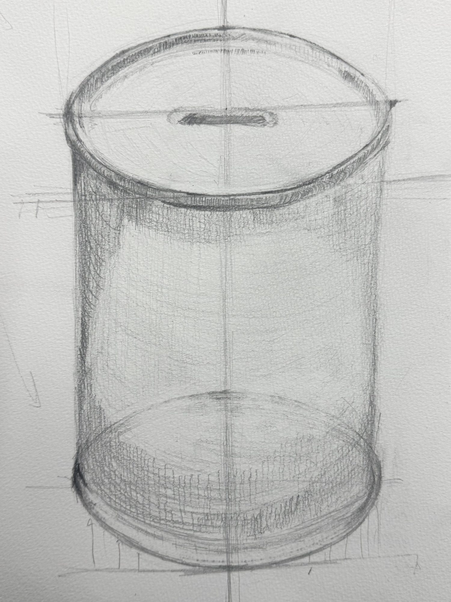 円柱の形をとても丁寧に観察していて、上と下の楕円の奥行きの違いがしっかり描けていますね😊✏️