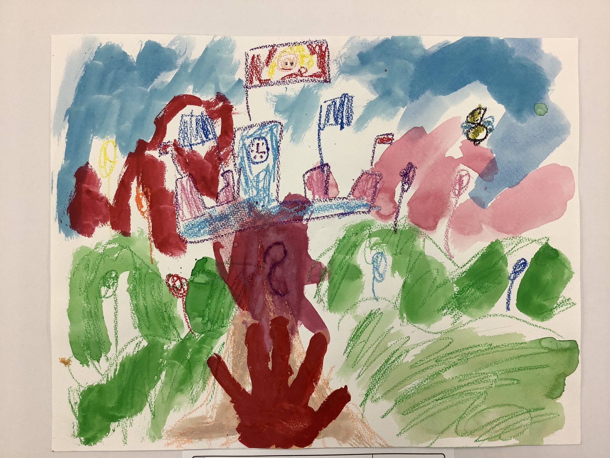 あおい空の下に、いろいろな色でつくられた「おひめさまのおしろ」が、にぎやかに立っていますね。クレヨンの線と絵の具の色が重なって、やまやもり、道までつながって見えます🏰🌈