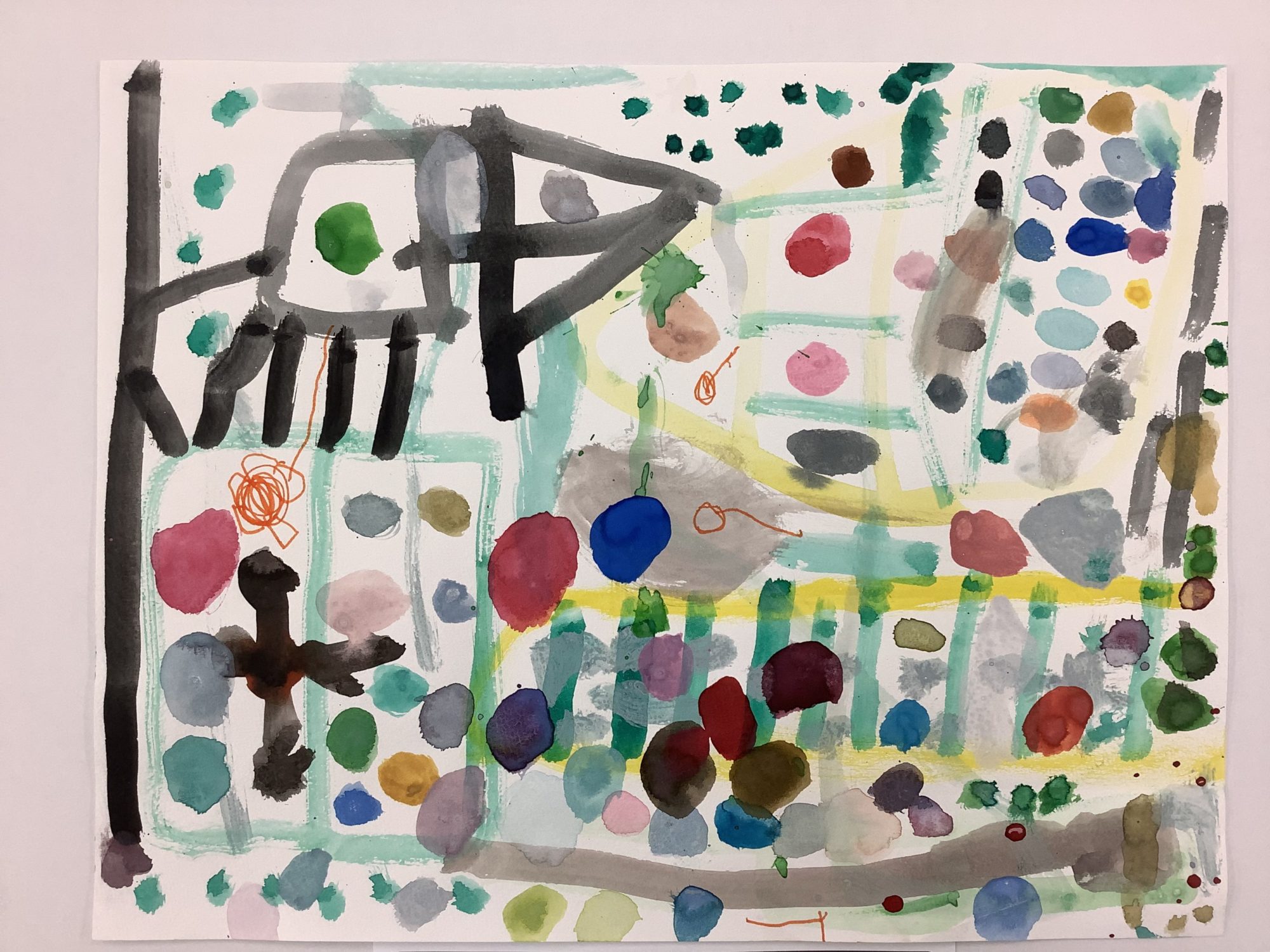 まるい「にんげん」たちが、このおうちの中で行ったり来たりしているようで、どんな声が聞こえてくるのかな、と私は想像しました。たくさんの色をえらびながら、楽しい気持ちで描いていたのかな、と感じます😊