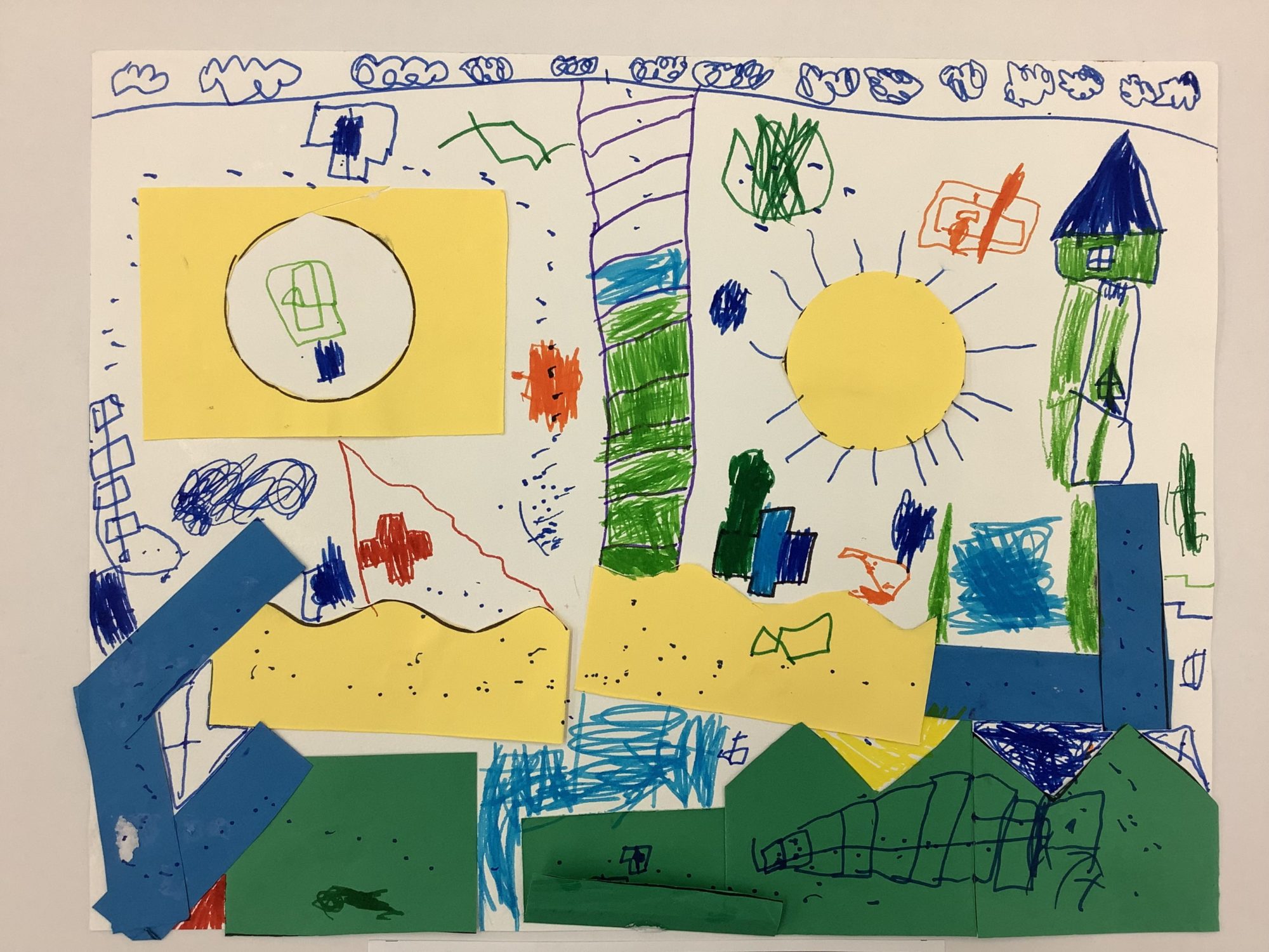 紙をはったところと、ペンやクレヨンで描いたところがまざりあって、とてもたのしい「こうえん」になっていますね。すべりだいやたいよう、みちやくさが、画面のあちこちにつながって見えます🌞🌳
