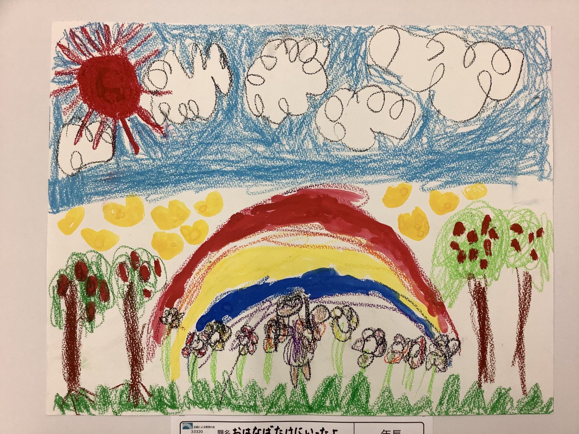 あおい空に、しろい雲とまっかな太陽が大きくえがかれていて、気持ちのいい一日が伝わってきます。にじの下には、たくさんのお花や木がならんでいて、はなばたけのひろがりを感じました🌈🌸