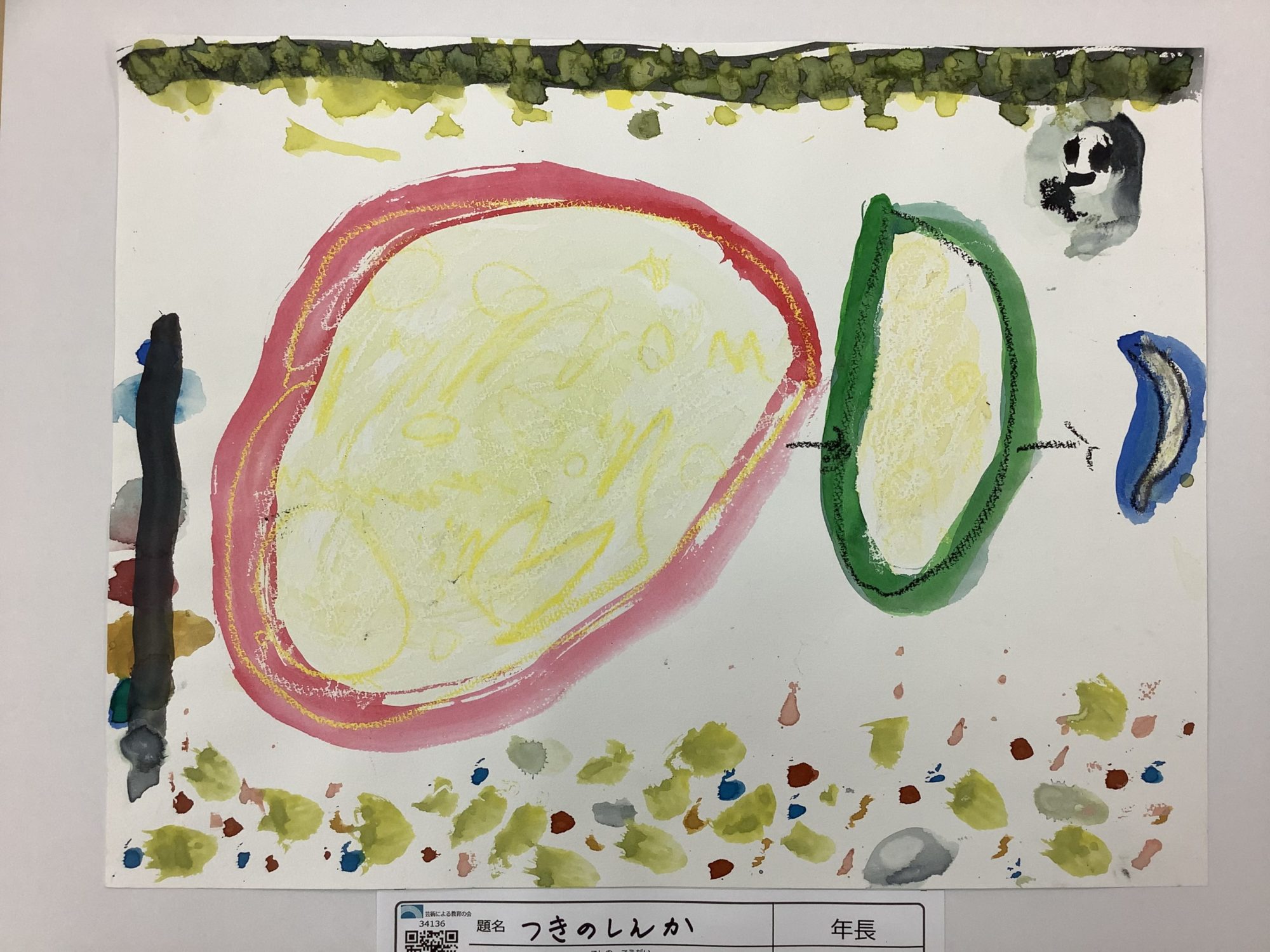 「つきのしんか」という題名から、月をじっと見て、「さっきとちがう」「つぎはどうなるかな」と考えながら描いていたのかな、と私は感じました。やさしい色を重ねているところに、月を大切に見ている気持ちが表れています😊