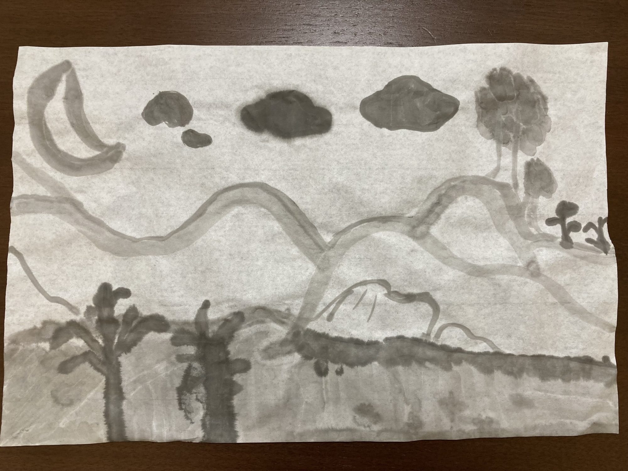 やわらかい薄墨の山の線、深い影をつくる木々、ふわっと浮かぶ雲…それぞれの濃淡がとても美しくて、風が静かに流れているように感じます。