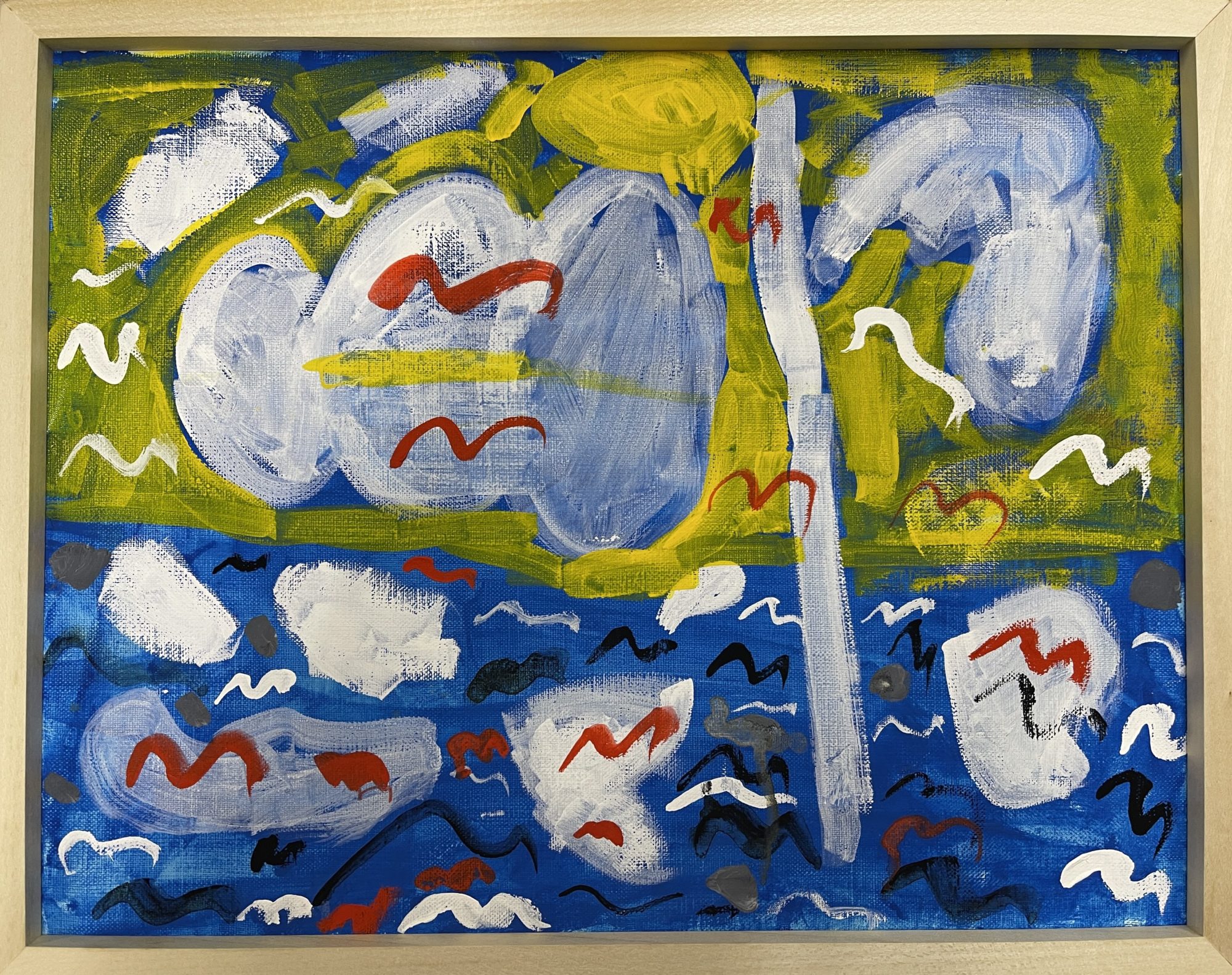 白いかたまりや、くねっとした線がリズムよく散らばっていて、「かあかあ」という声が空を行ったり来たりしている感じがします🕊️