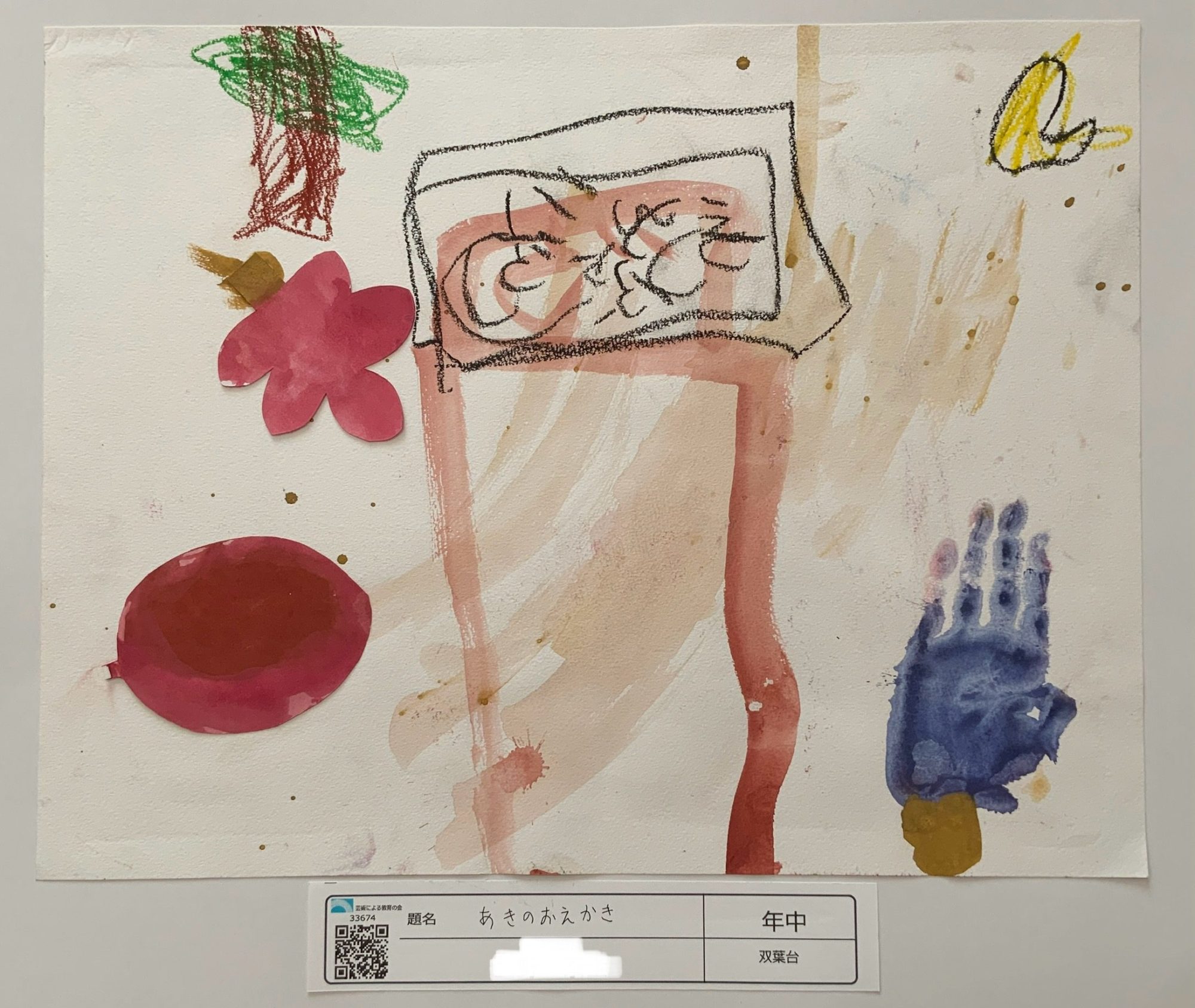 あかやちゃいろのやさしいいろが、かみの上をすーっとながれていて、えのまんなかのかたちは、あきのもりの入りぐちや、ひみつのばしょみたいですね。はっぱのかたちや、てがたのあともあって、「さわった」「ためした」っていうたいしさんのうごきが、えの中にそのままのこっています🍁✨