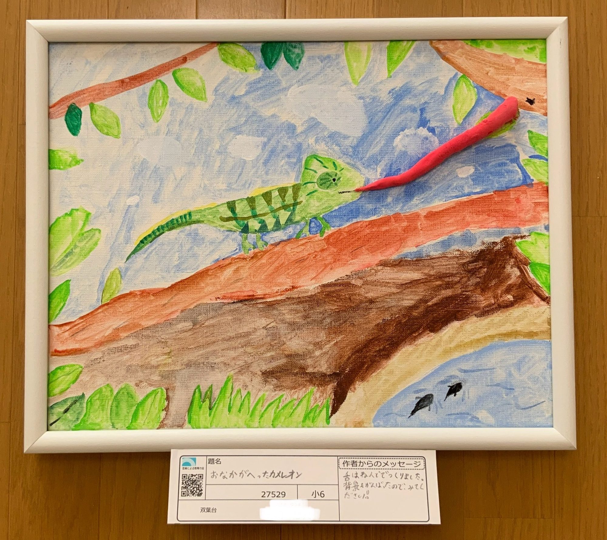 わかめせんせい 先生2025年12月27日 4:41 PM nozakiyuumaさんへ 枝の上を進むカメレオンの姿から、 「おなかがへった…!」という気持ちが、 今にも動き出しそうに伝わってきますね🦎✨ 体の模様や色の重なりがとてもていねいで、 葉っぱや木の色とも自然につながっていて、 カメレオンがその場所にちゃんと“いる”感じがします。 特に、ぐーっと伸びた赤い舌がこの絵の主役で、 一瞬の動きをつかまえたところがとてもステキです🎯 空や水、地面まで描かれているので、 この世界の広さや空気も感じられます。 もし次に描くとしたら、 このカメレオンは無事にエサをつかまえられたと思う? それとも、このあと何が起こるかな?😊 ログインして返信する ↓