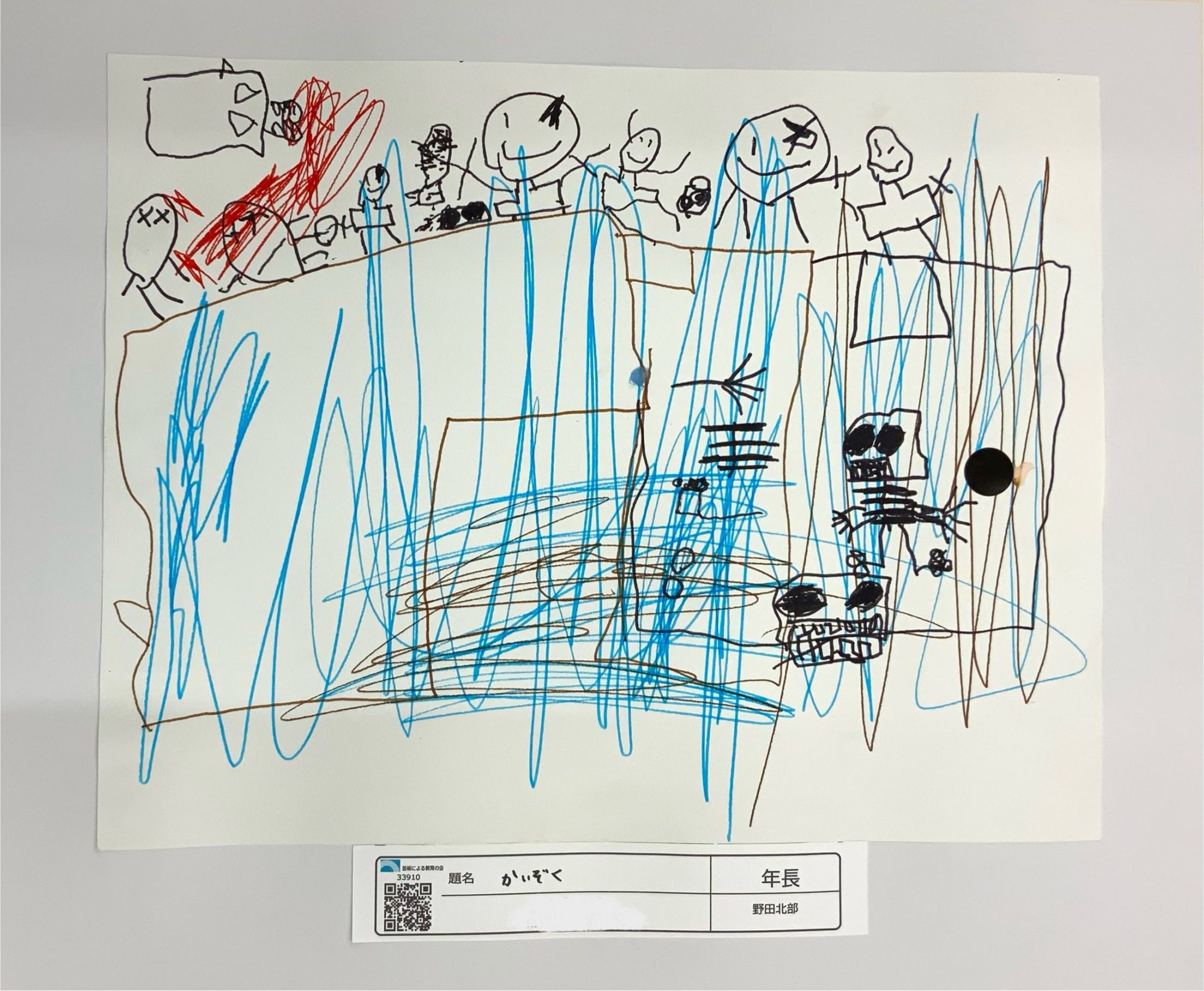 わかめせんせい 先生2026年1月3日 6:54 PM ももじょさんへ。 画面の上に並んだたくさんの人たちと、 下からのびる青い線が、 どきどきする海の深さや動きを強く感じさせます🌊 上は船の上、下は海の中… そんなふうに、世界が上下に分かれているのがとてもおもしろいです。 赤や黒の線で描かれた顔や体は、 笑っていたり、こわそうだったり、 それぞれちがう気持ちを持っているみたいで、 「この海ぞくたちは、今なにをしているんだろう?」と 物語を考えたくなりました⚓️ 青い線を何本も重ねて描いたところから、 海がざぶざぶ動いている感じや、 大きな音まで聞こえてくるようです。 このあと、 かいぞくたちは宝を見つけたのかな? それとも、まだ冒険の途中かな? ログインして返信する ↓
