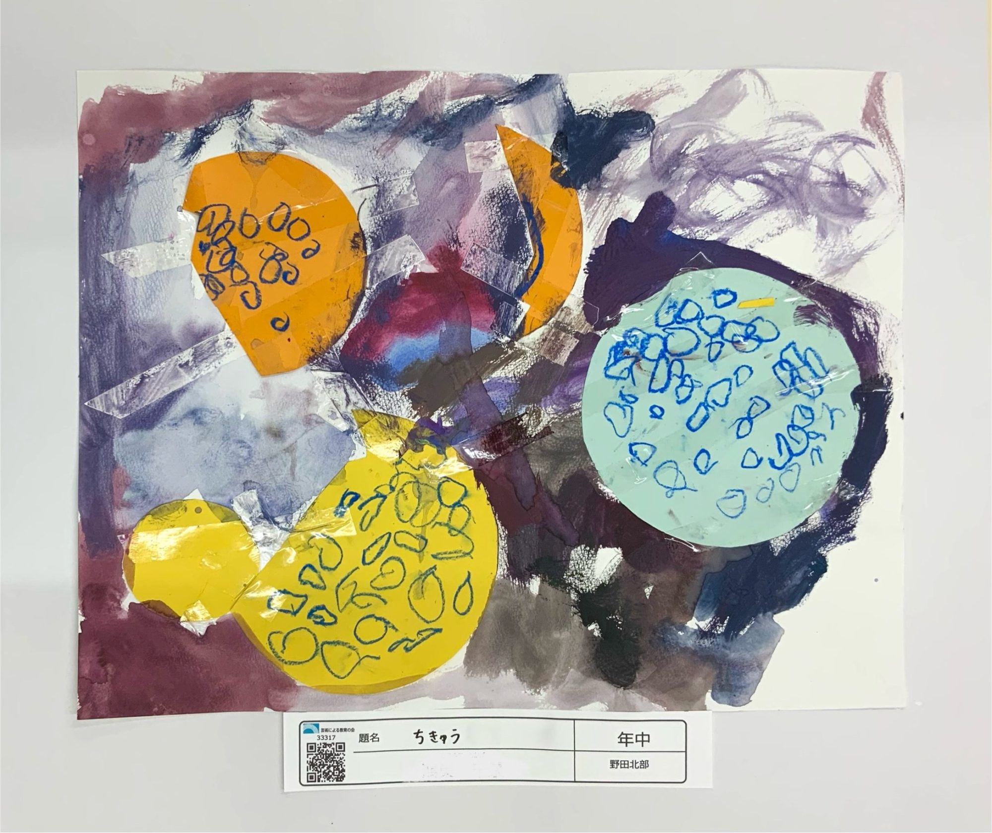わかめせんせい 先生2026年1月3日 7:12 PM ちかげさんへ。 いくつもの丸いかたちが重なって、 まるで宇宙の中に浮かぶ「ちきゅう」を見ているようです🌍 黄色やみずいろ、オレンジの丸の中に描かれた線が、 大地や雲、海の動きをひそひそ話しているみたいですね。 まわりを包むむらさきや青の色も、 夜の空だったり、宇宙の深いところだったり、 ちきゅうをやさしく守っている感じがします。 紙を貼ったところと、絵の具がにじんだところのちがいも、 さわってみたくなるようなおもしろさがあります🎨 この「ちきゅう」には、 どんな生きものや音があるのかな? ログインして返信する ↓