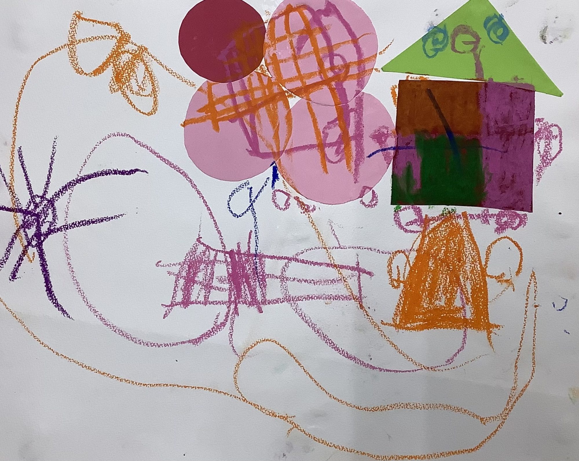 私はこの絵を見て、好きなキャラクターを思い浮かべながら、わくわくした気持ちで手を動かしていたのかな、と感じました。形や色を組み合わせる力が、のびのび育っています。