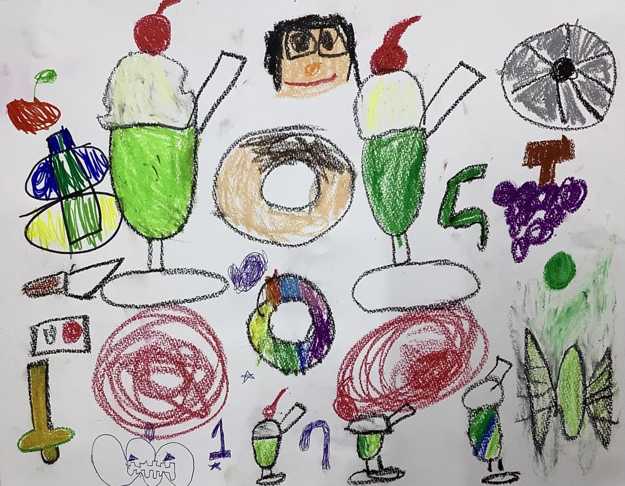わかめせんせい 先生2026年1月4日 9:05 AM あやなさんへ。 画面いっぱいに、アイスやドーナツ、くだものやジュースが並んでいて、とてもにぎやかなお店ですね。みどりのカップに白いアイス、赤いさくらんぼの色がよく目立って、ひとつひとつがていねいに描かれています🍦🍒 真ん中にいる「さいとうせんせい」の顔もにこにこしていて、お店の楽しさが伝わってきました😊 私は、このお店が「見ているだけで楽しくなる場所」だと感じました。好きなものをたくさん思い出しながら、のびのび描いているところがとてもすてきです✨ こんなふうに、思いを形にできる力は、これからもどんどん広がっていきますね。 このお店で、いちばん人気になりそうなのはどれだと思う? ログインして返信する ↓