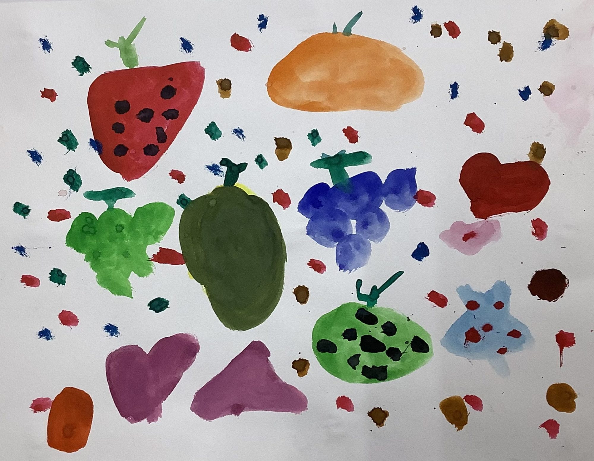 形も色もそれぞれちがっていて、「どれもだいすき!」という気持ちが伝わってきます。やさしい色と、思いきりのいい筆のあとが合わさって、楽しいリズムが生まれています😊