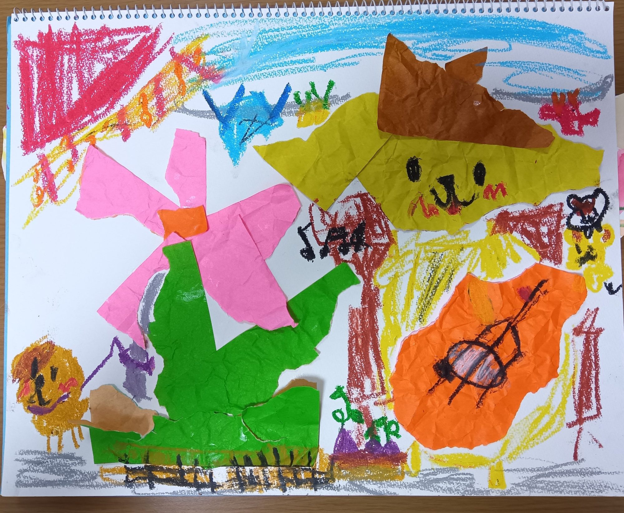 背景の空の色、洗濯物、友だちや飼い犬まで描いてあって、**「秋晴れの1日をまるごと描いた物語の1ページ」**のように感じました。ちぎり紙とクレヨンを自由に組み合わせて、自分の世界を表現できるのは、sawaさんのすてきな力です。