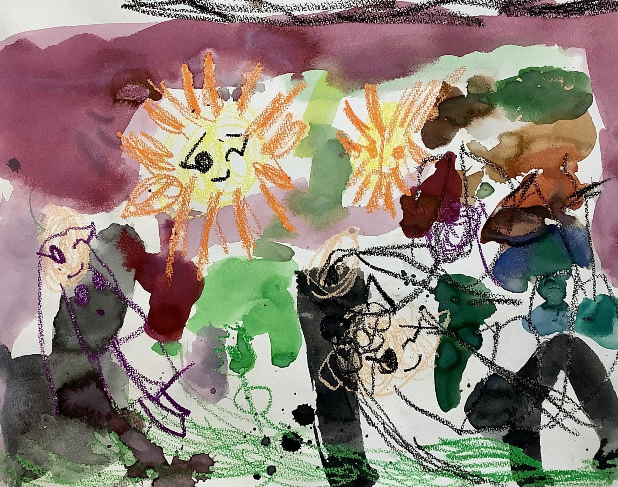 空いっぱいに広がるむらさきやみどりの色が、とても大きな世界をつくっていますね。にじんだ色が重なって、「ここはどんな場所なんだろう?」と、見ている人の想像がぐんと広がります。