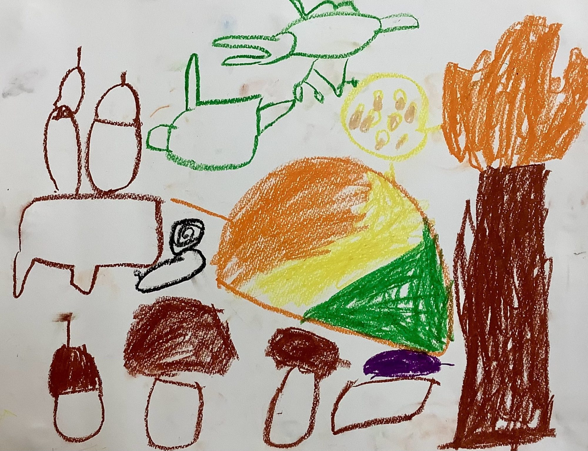 わかめせんせい 先生2026年1月4日 10:05 AM さくたさん、 画面いっぱいに秋の仲間たちが集まっていて、とてもにぎやかですね。 どんぐりやきのこ、大きな木、そして空を飛ぶものまで、形や大きさを変えながら一つ一つていねいに描かれているのが伝わってきます。 色も、茶色やオレンジ、黄色や緑が気持ちよく並んでいて、秋の空気を感じました。 きっと、秋を見つけるのが楽しくて、次々に描きたくなったのだろうなと想像しました。 私は、この絵から「秋ってたくさんあるんだよ」という声が聞こえてくるように感じました🍁🍄🌰✈️ この仲間たちは、これから一緒に何をすると思う? ログインして返信する ↓