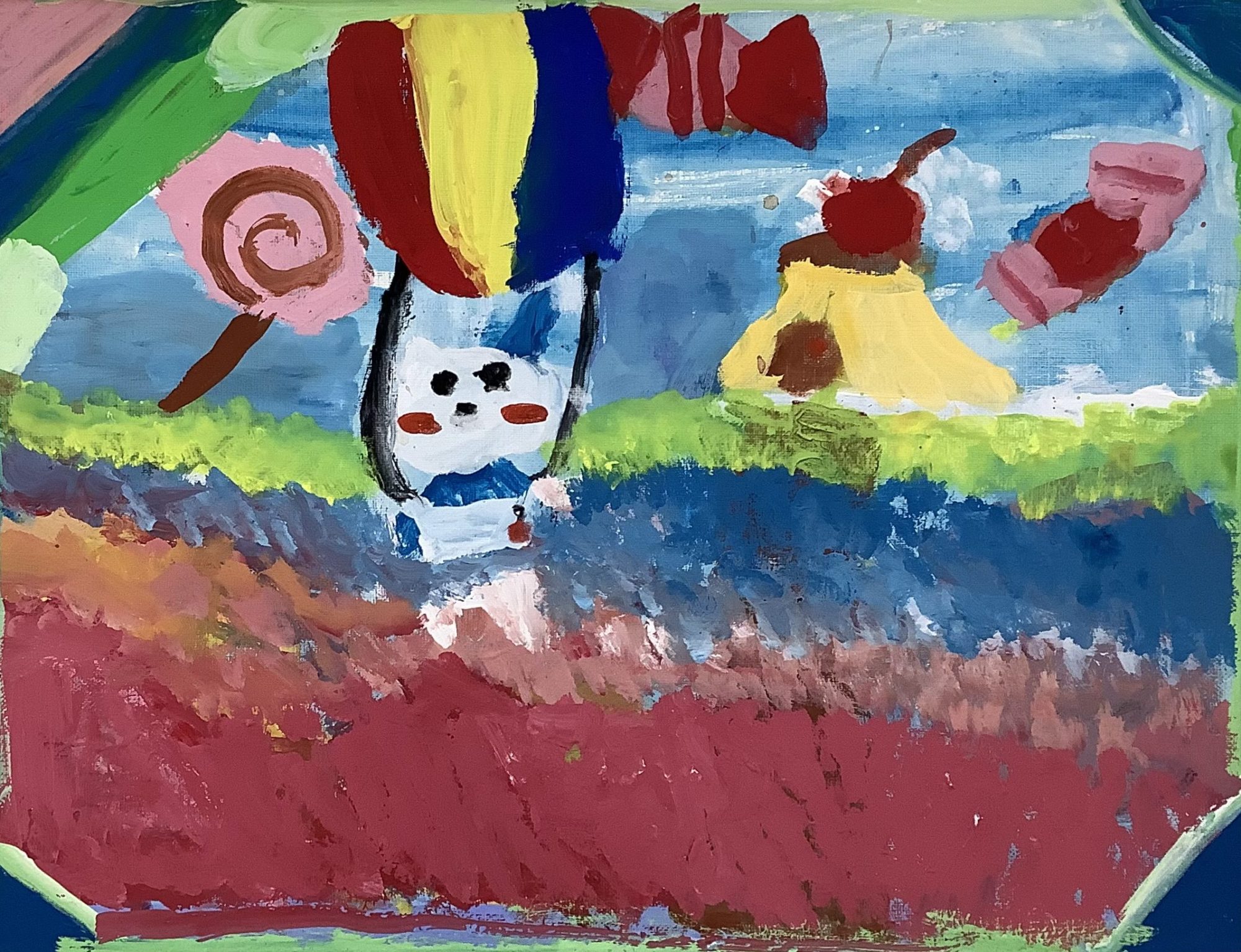 わかめせんせい 先生2025年12月28日 11:06 AM みーみさんへ。 空いっぱいに広がる色の層と、真ん中でふわっと浮かぶネコの姿が、とても印象に残ります。 赤・青・黄の大きな形や、地面のざらざらしたタッチから、風やスピードの感覚まで伝わってきます🎈🎨 「飛びたい」「どこかへ行ってみたい」という気持ちを、ネコに託して描いたのかな、と私は感じました。 思い切って大きな色を重ねたことが、画面に強さと楽しさを生んでいます✨🐱 もしこのネコがさらに高く飛ぶとしたら、空や景色はどんなふうに変わると思いますか?🌈 ログインして返信する ↓
