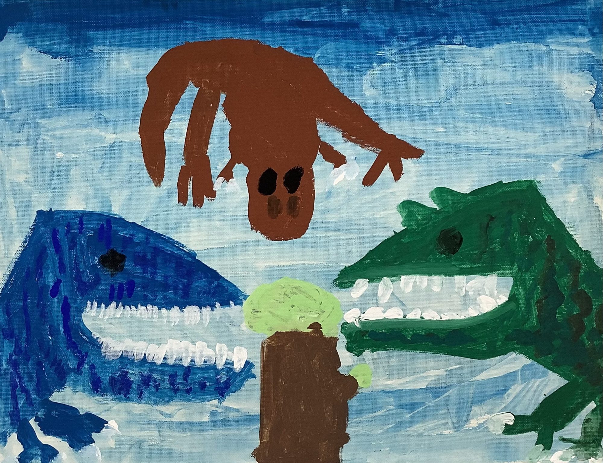わかめせんせい 先生2025年12月28日 11:12 AM 1496Ymk0727さんへ 画面の中に、戦う直前の“静けさ”がしっかり描かれています。 大きな口を開けた恐竜たちと、上から見下ろす存在の配置が、空気が張りつめる一瞬をつくっています🦖🦕 色も、青・緑・茶をはっきり分けて使っていて、それぞれの恐竜のちがいが一目で伝わってきます🎨 今にも動き出しそうな気配を、形と間(あいだ)で表せているところが、とてもおもしろいです。 もしこの一瞬のあとを描くとしたら、動きはどんな線や色になると思いますか?✨ ログインして返信する ↓