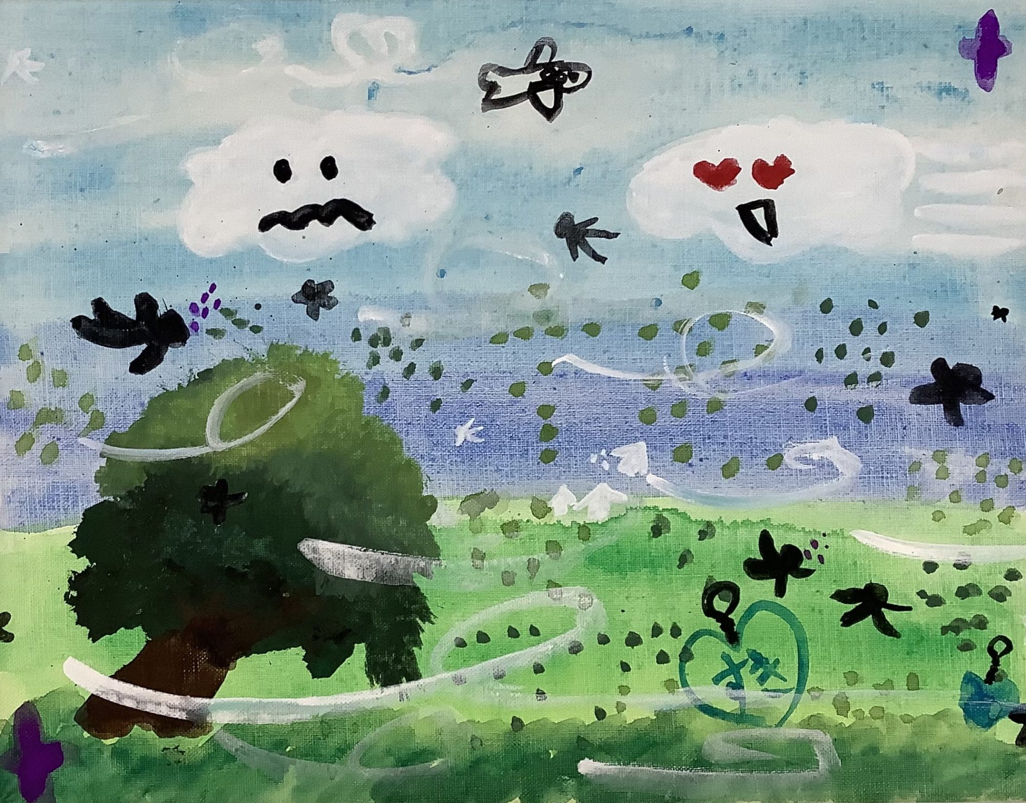空と大地をわたる風の動きが、線や点、うずまきで生き生きと表されていますね。雲の表情や小さなモチーフが、画面のあちこちで会話しているようで、見ている私の気持ちも軽くなります🍃☁️