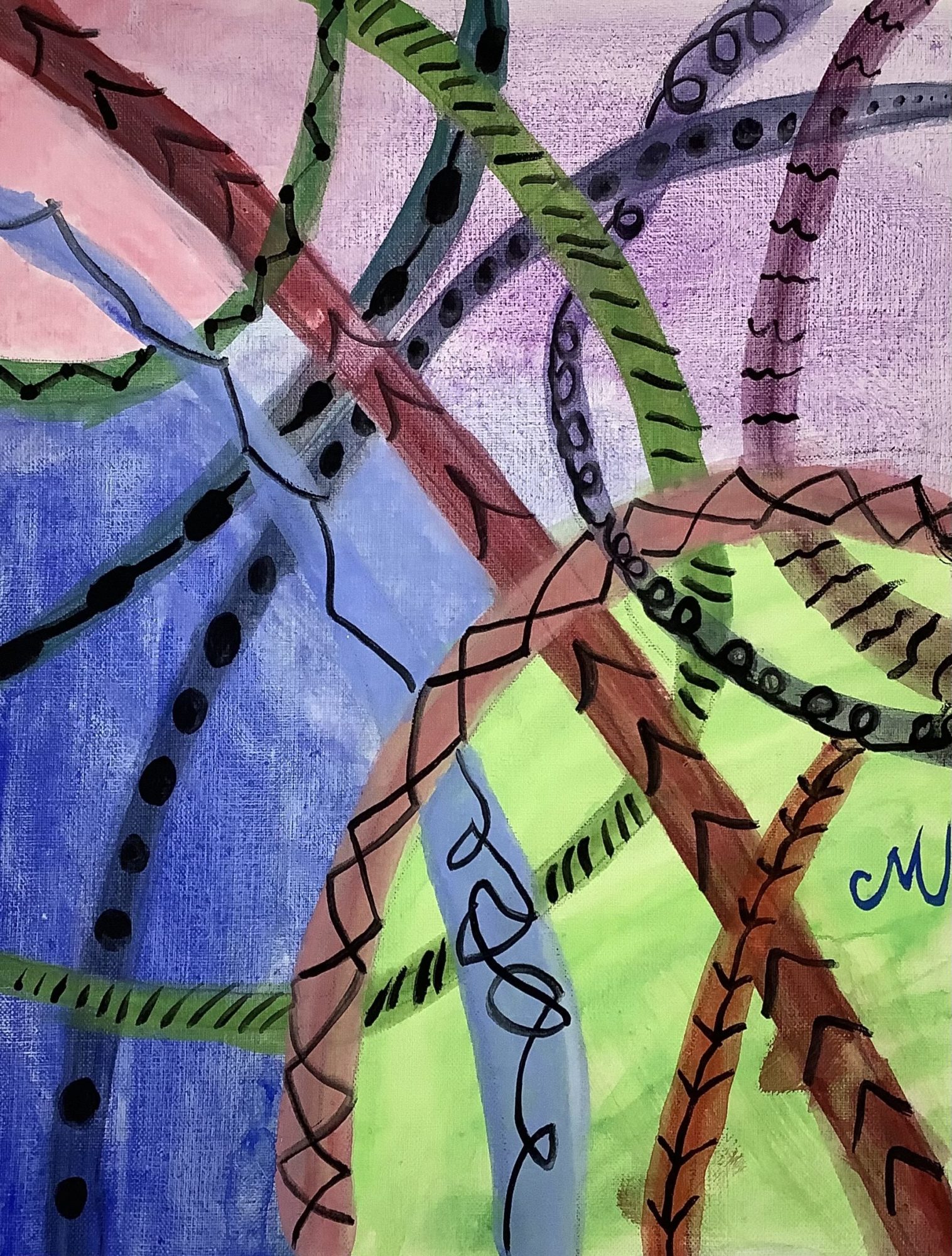 形を決めすぎず、線や色のリズムで表現しているところが、この作品の大きな魅力です。