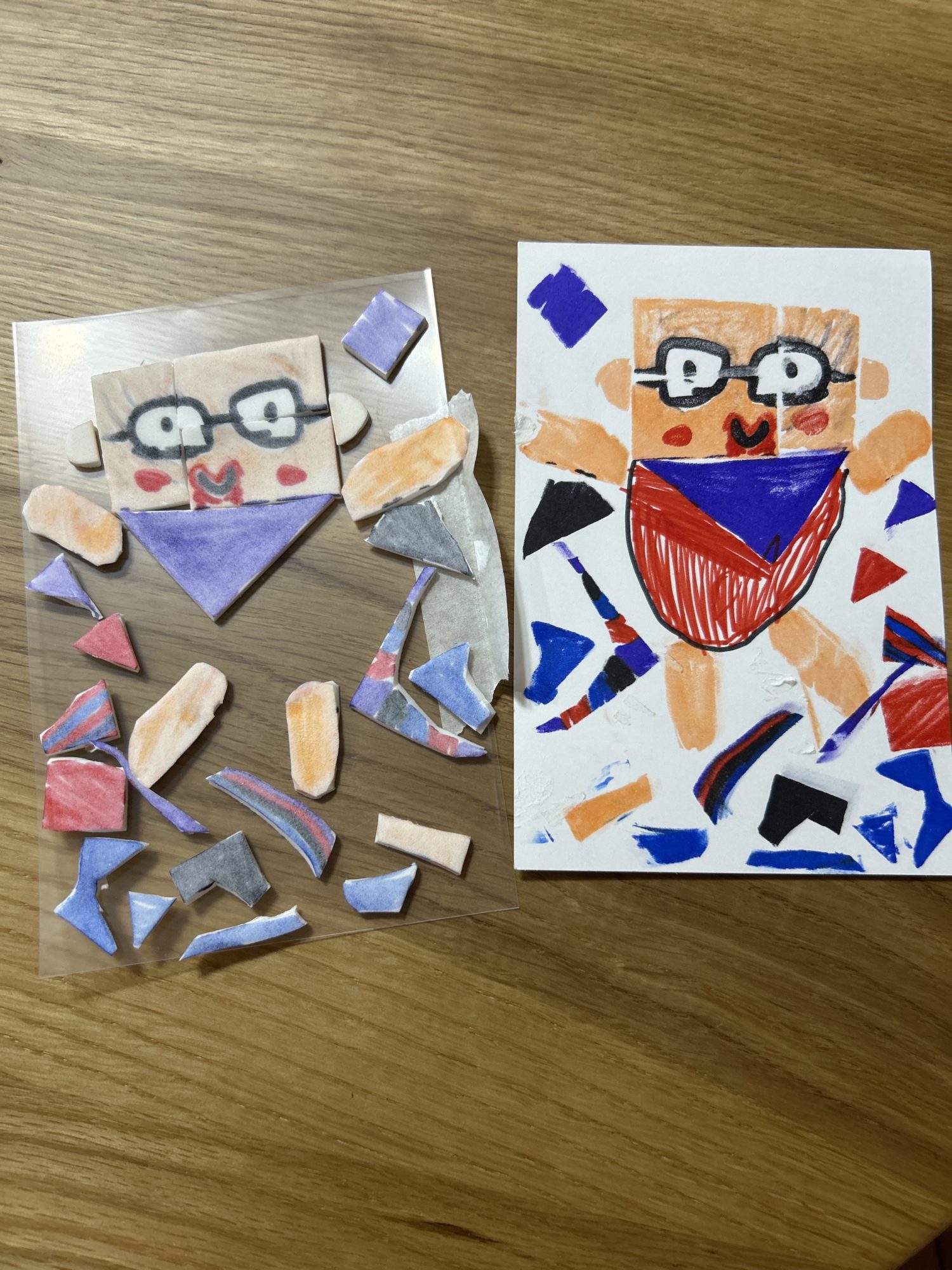 刷り映しの形を組み合わせながら、体や服のパーツを自分の発想で並べていく様子が、ひとつひとつの色や形にあらわれています。