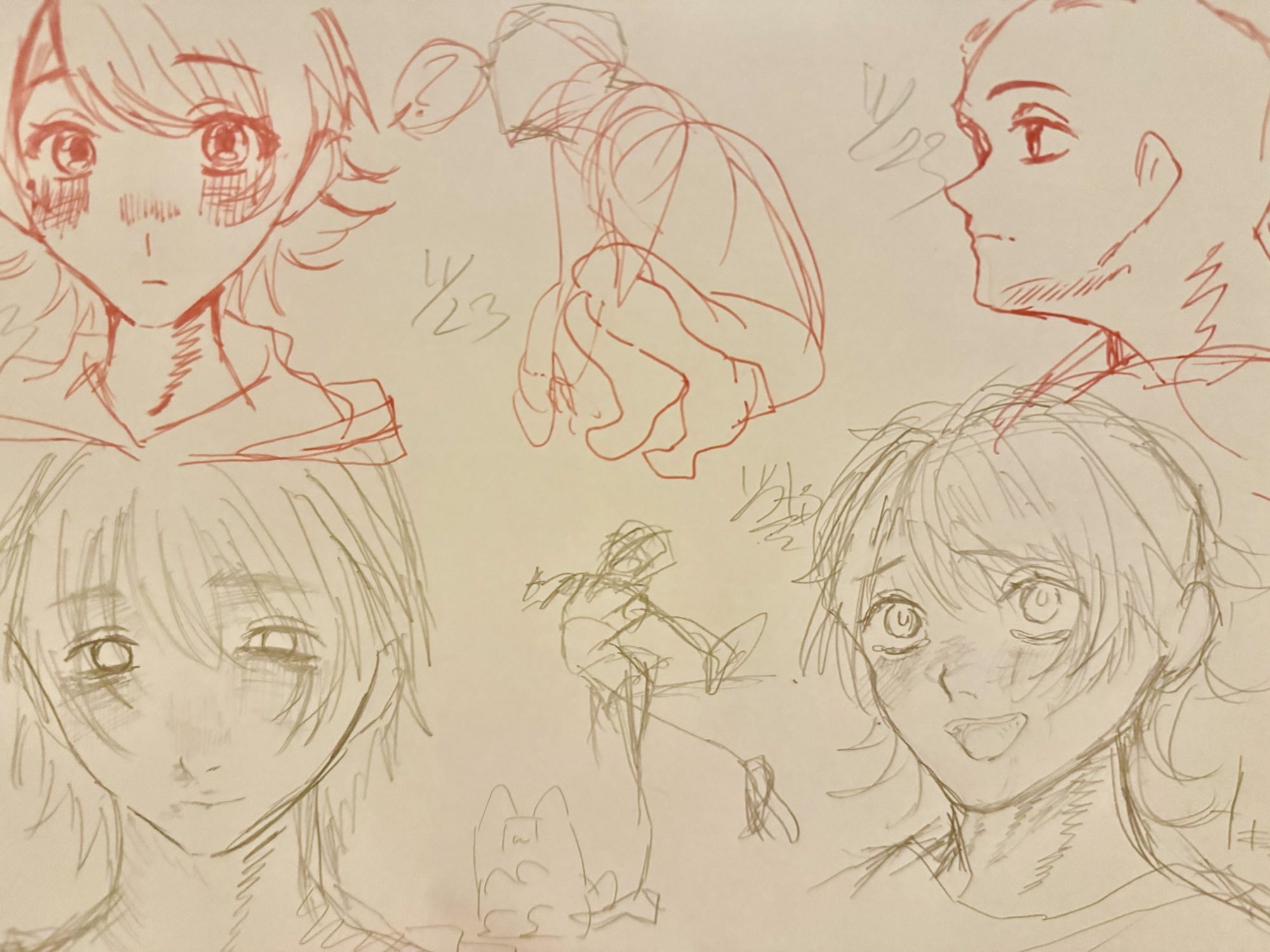 わかめせんせい 先生2025年11月24日 7:05 AM ちあきさん 落書きとは思えないほど、線の表情が豊かでとても魅力的ですね✨ 赤と鉛筆の線を混ぜて使うことで、 それぞれのキャラクターの気持ちや性格が ふわっと立ち上がってくるように感じました。 特に、右下の笑顔のキャラクターは 目の中の光やほほのやわらかい影がとても心地よくて、 「この子はどんな場面にいるんだろう?」と想像がふくらみます😊 描きながら、どのキャラクターがいちばん楽しかったですか? 🎨💭 ログインして返信する ↓
