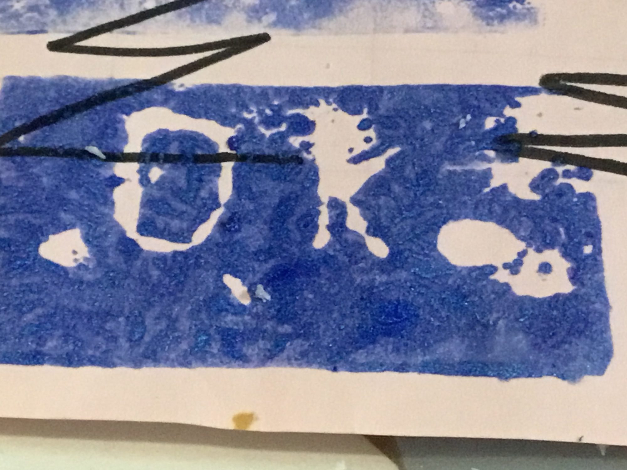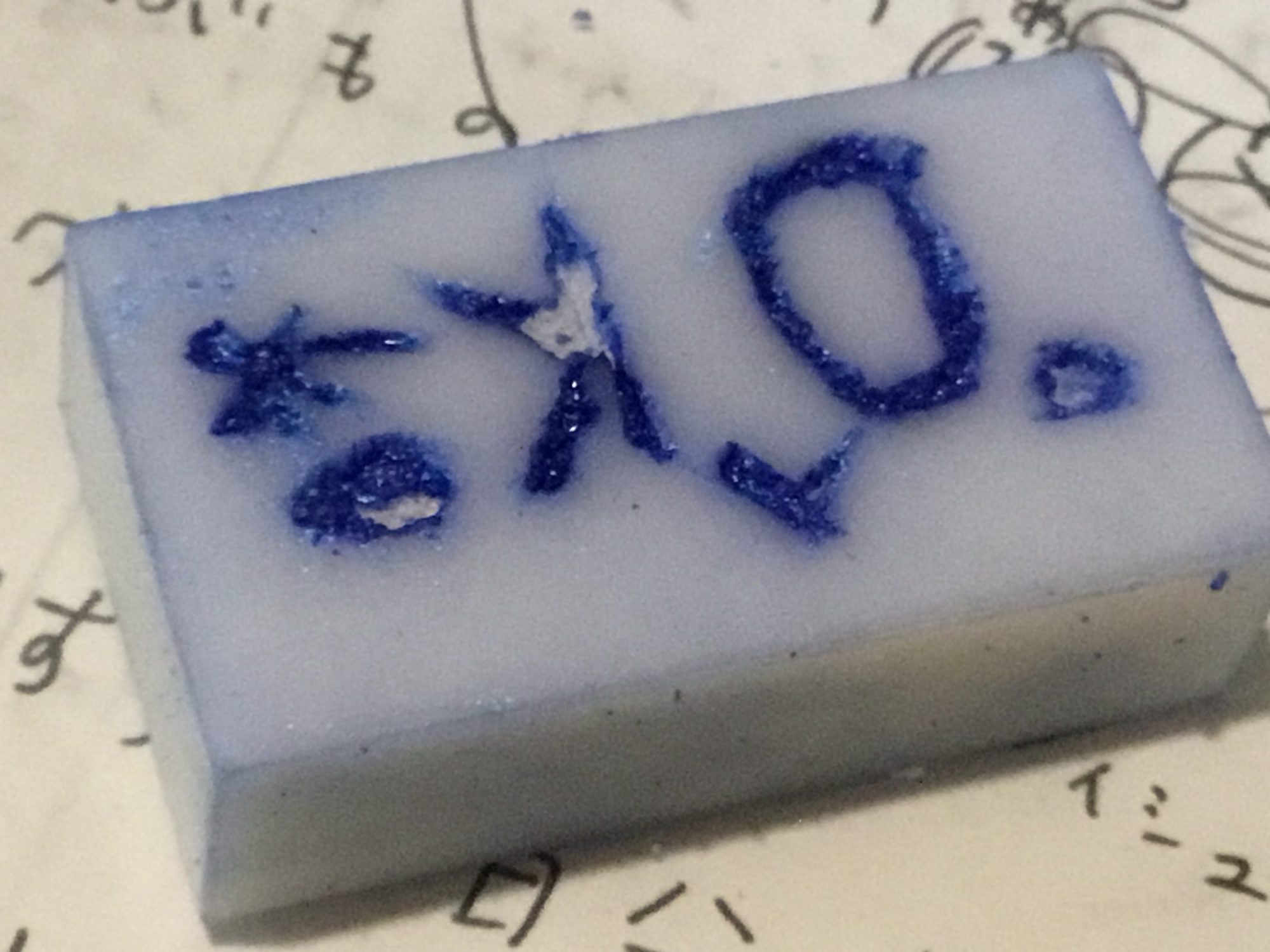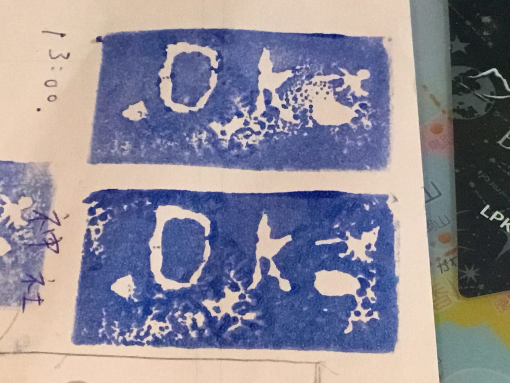 彫った文字やニコちゃんの形がスタンプになると、まるで魔法みたいに白い部分が浮かび上がって、とてもおもしろいですね。
