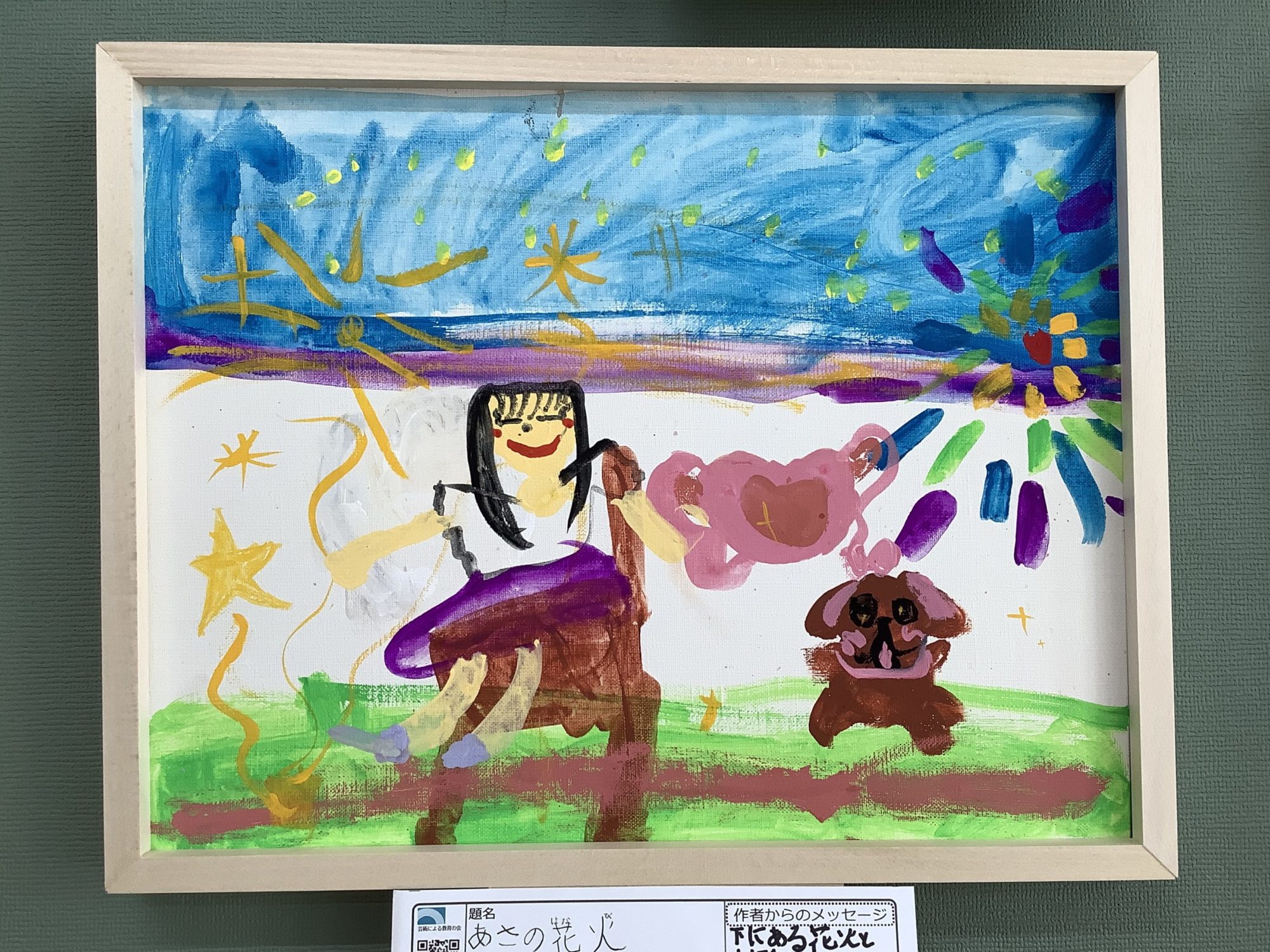 青い空に広がる筆の動きと、黄色や緑の点や線が重なって、朝の空気がきらきら揺れているのが伝わってきます。人物と犬の配置も画面にリズムを生み、花火が音や光になって飛び散っているようですね✨🎆
