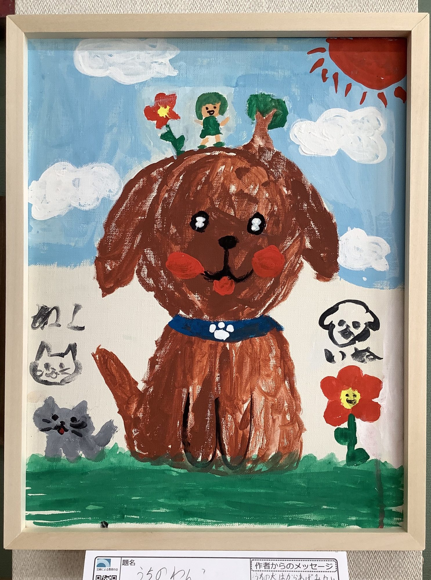 画面のまん中に大きく描かれたわんこが、とても堂々としていて、まっすぐこちらを見つめてきますね🐶✨