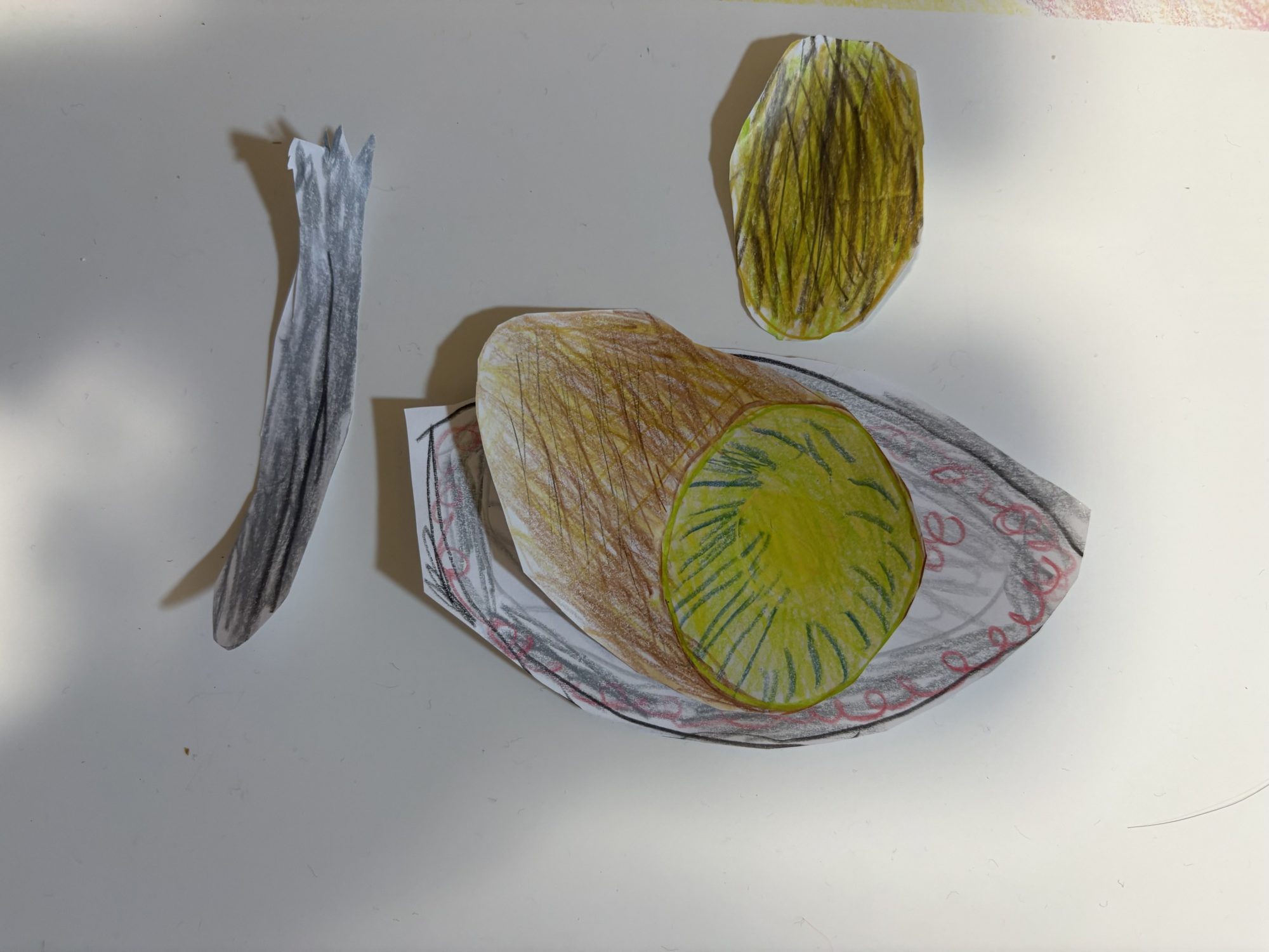 お皿やフォークまで自分で作ったところに、「キウイをぜんぶ楽しみたい!」という気持ちがあふれていて、とてもすてきです。作品全体がまるで“いただきます”の一瞬を切りとったようで、見ている私も笑顔になりました😊🍴