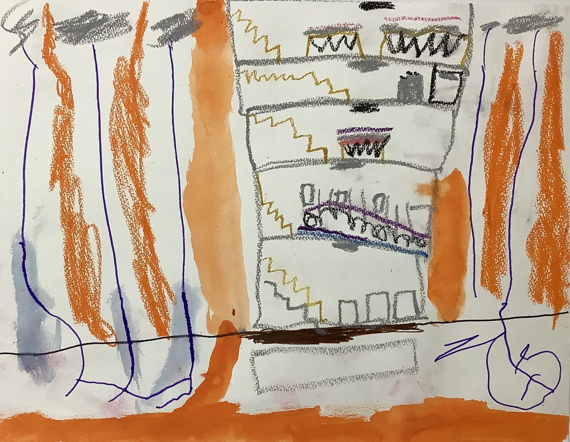 オレンジやグレーの色がたくさん使われていて、たての線がいっぱいあるところから、高くて大きな建物だということがよく伝わってきます。