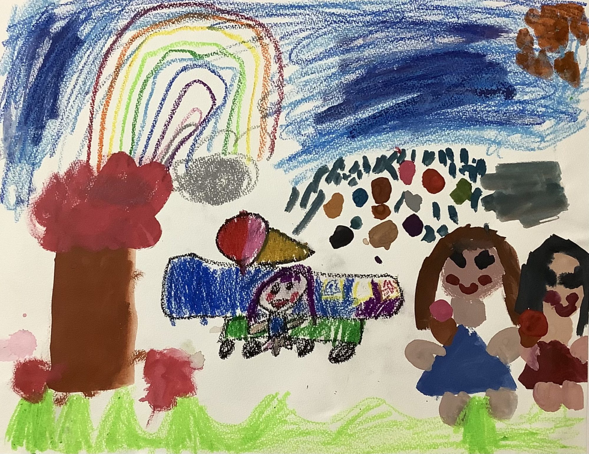 大きな木と、その上にかかるにじが、画面をやさしく包んでいて、とても気持ちのいい景色ですね。アイスクリームやさんのまわりには、色とりどりの点や形が集まっていて、にぎやかで楽しい場所だということが伝わってきます。クレヨンののびのびした線と、カラーペンの細い線が重なり、人物やアイスがはっきり見えるところもすてきです🍦🌈