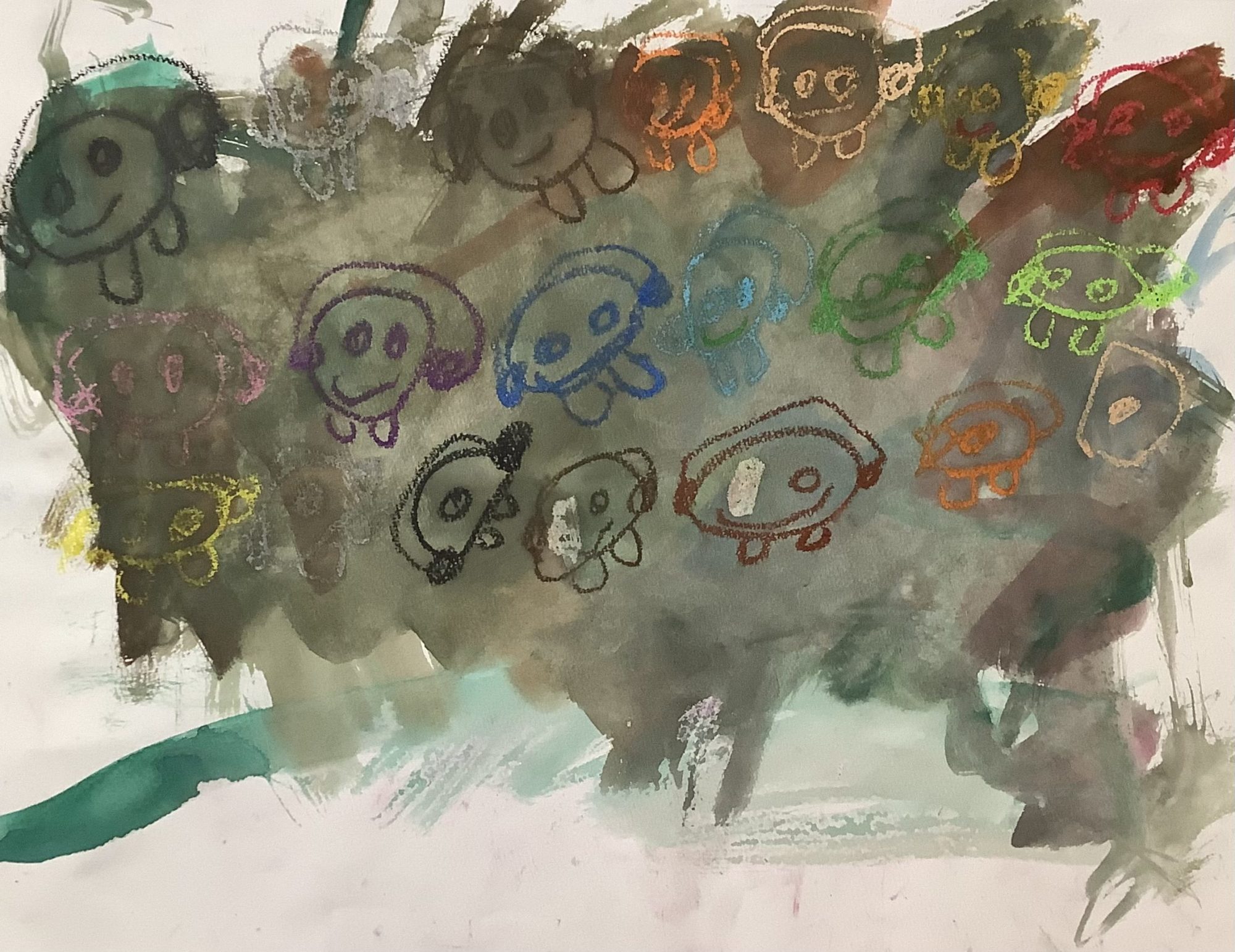 画面いっぱいに、たくさんの人の顔や体がならんでいて、色も線もとてもにぎやかですね。クレヨンの太い色の上に、カラーペンの細い線で目や口、なわとびの動きが描かれていて、跳んでいるリズムが伝わってきます。色が少しずつちがうのも、それぞれ別の人みたいで楽しいです😊🖍️